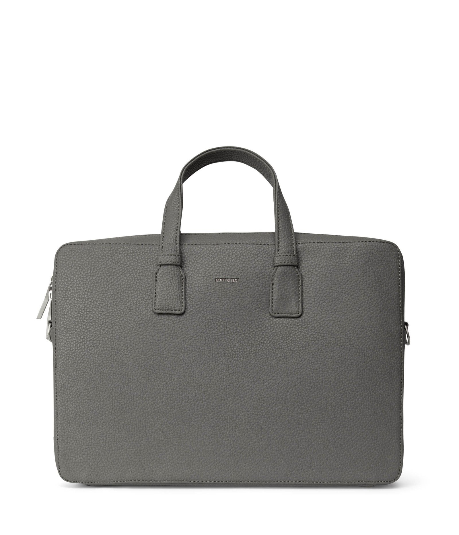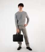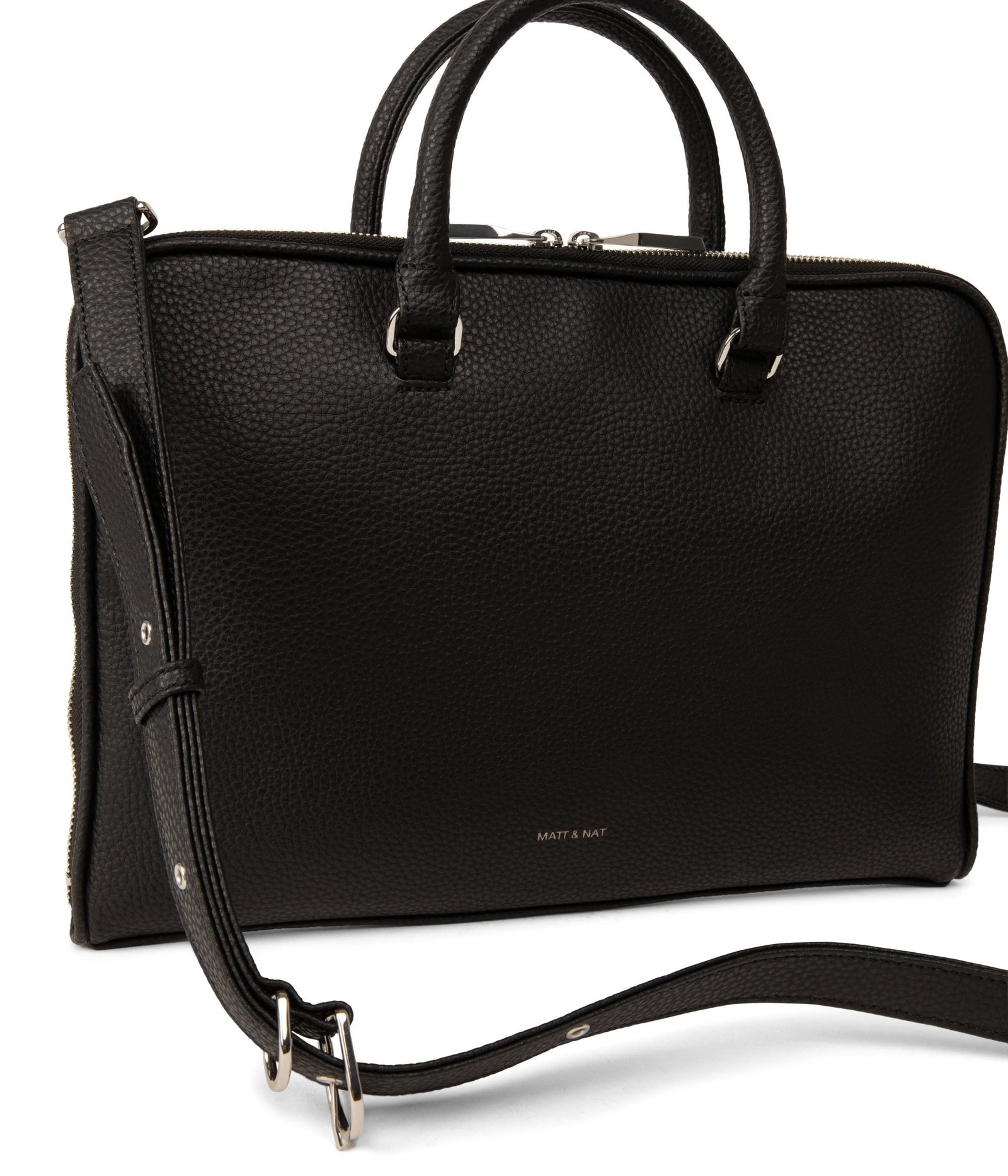A briefcase that can be worn crossbody with a detachable and removable shoulder strap. Top main zipper closure. Fits a 13 laptop.