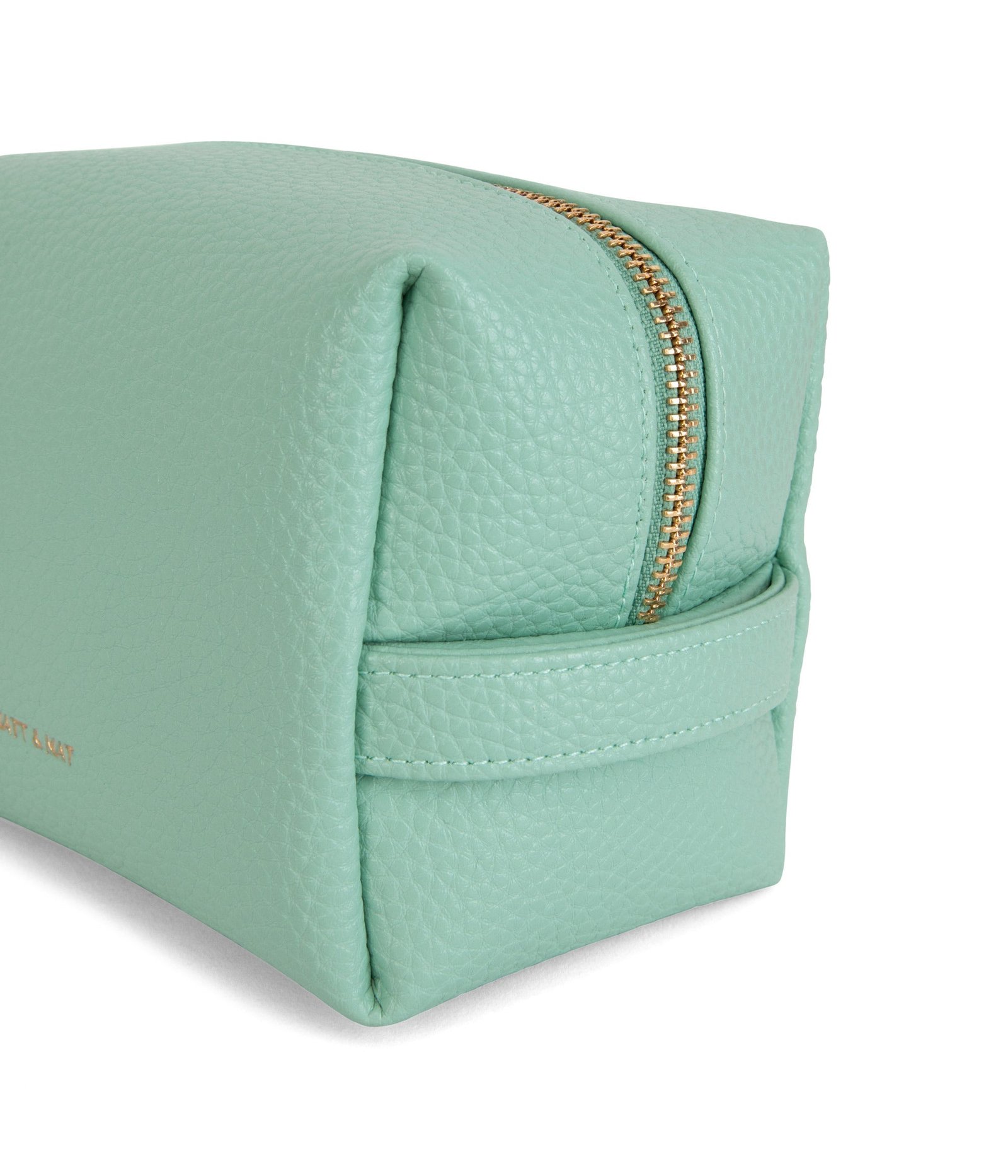 Small toiletry case with a top zipper closure and a handle on the right side.