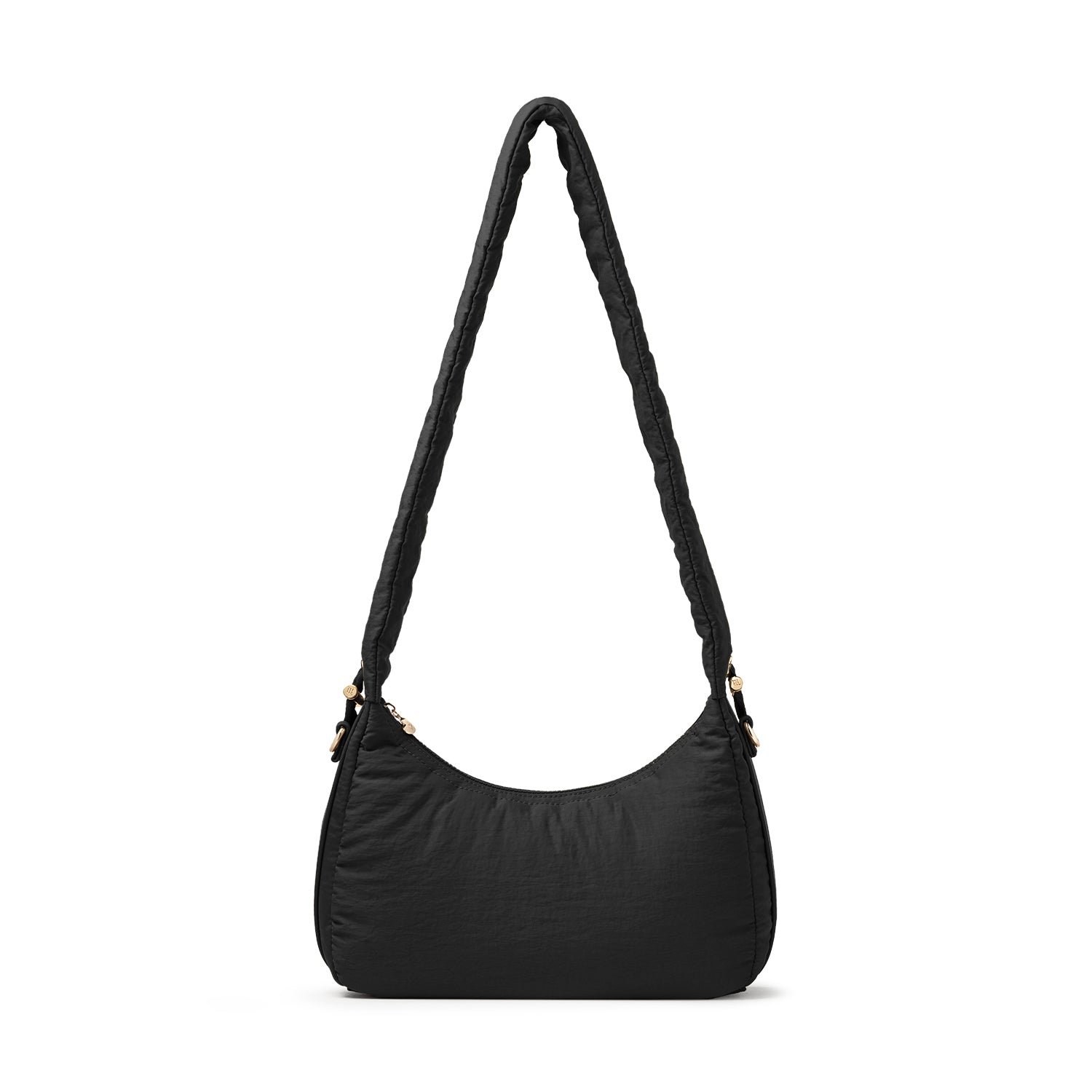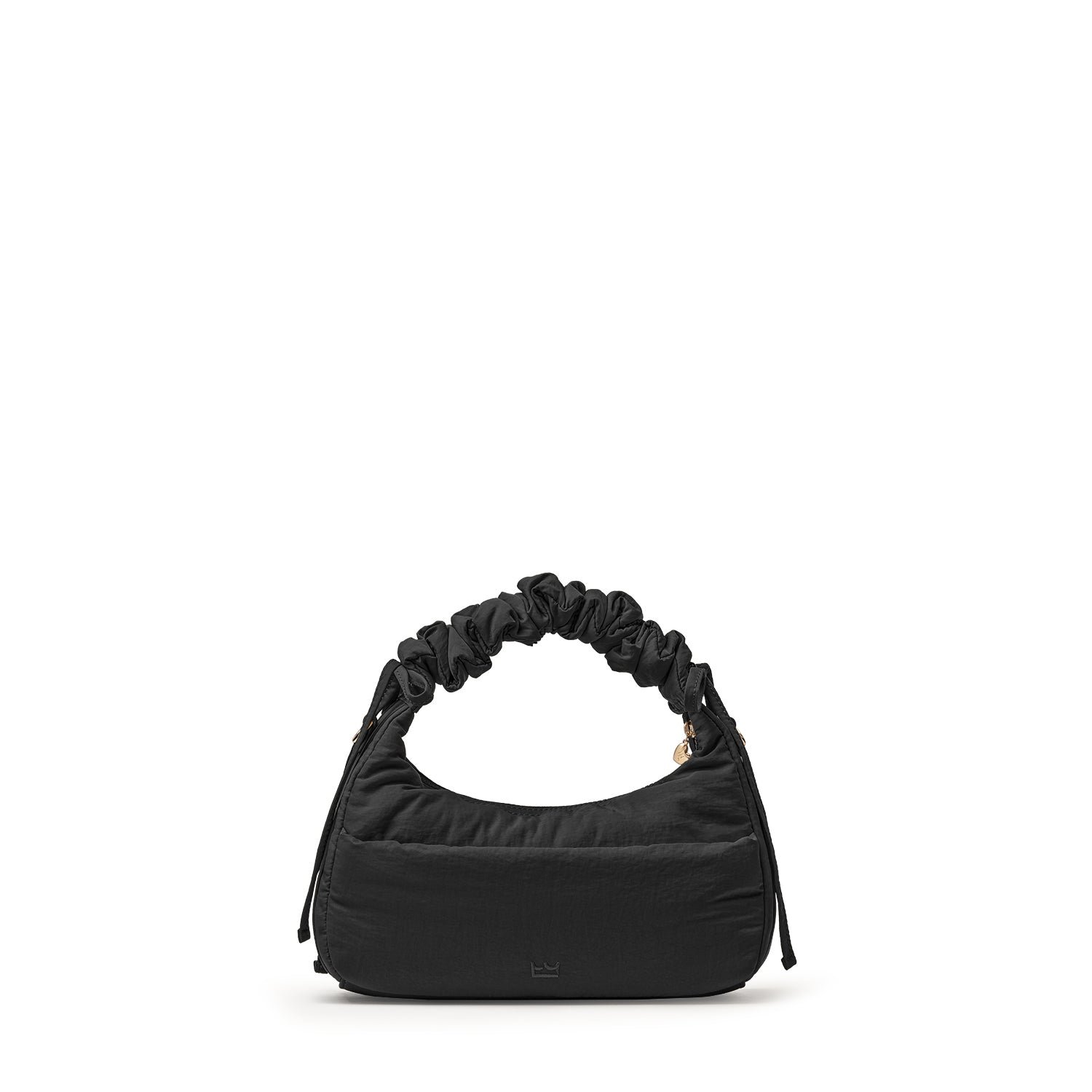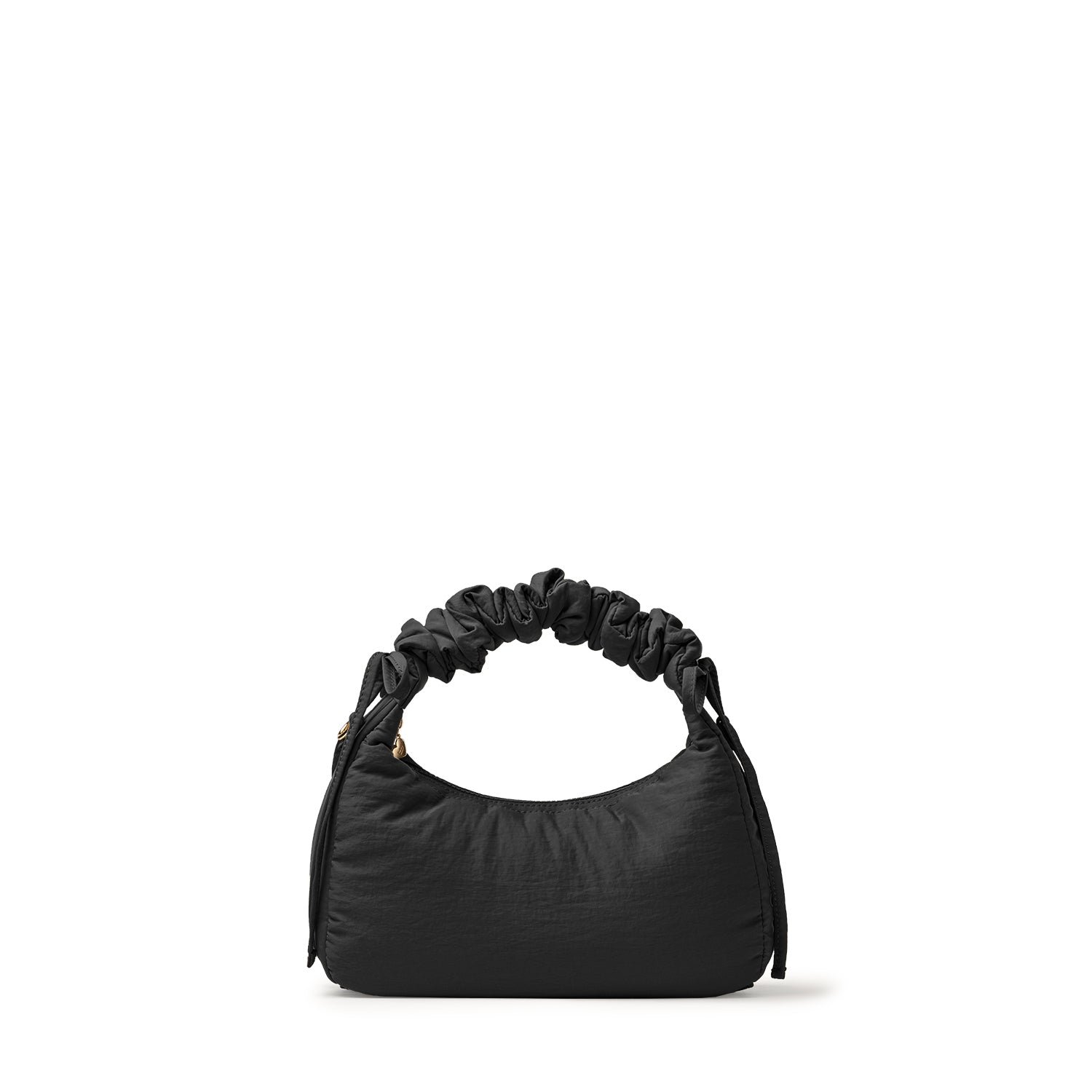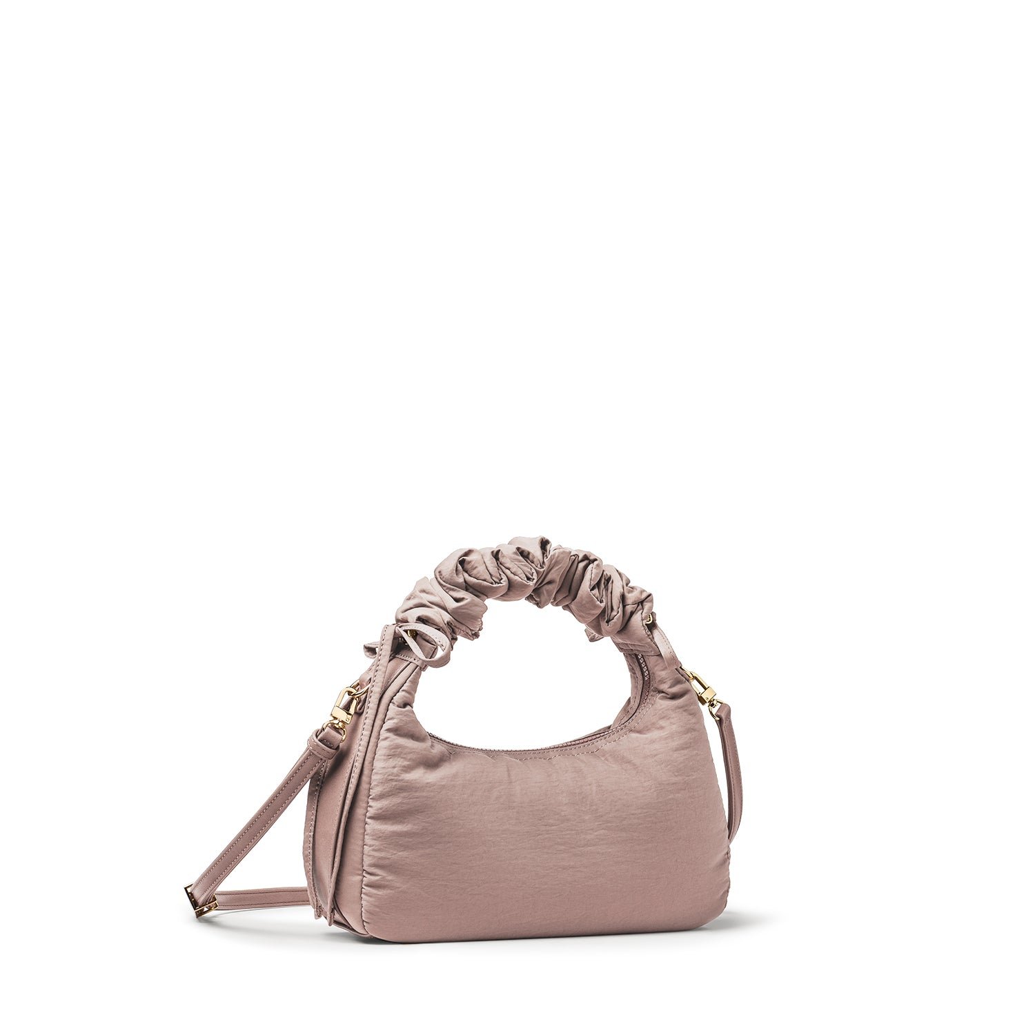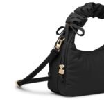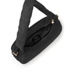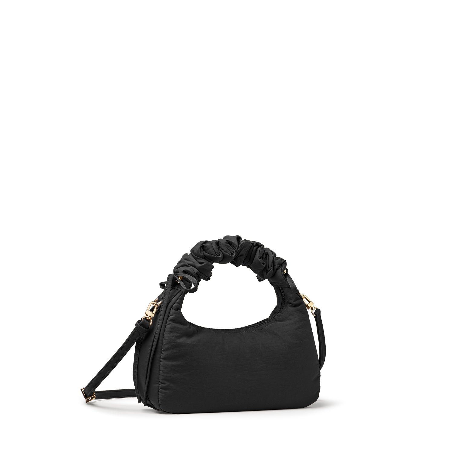 Carry it three ways: grab it by the scrunchie handle. sling it over your shoulder. or wear it crossbody with the long strap. The padded matte nylon body is water- and stain-resistant. ready to handle unexpected spills.