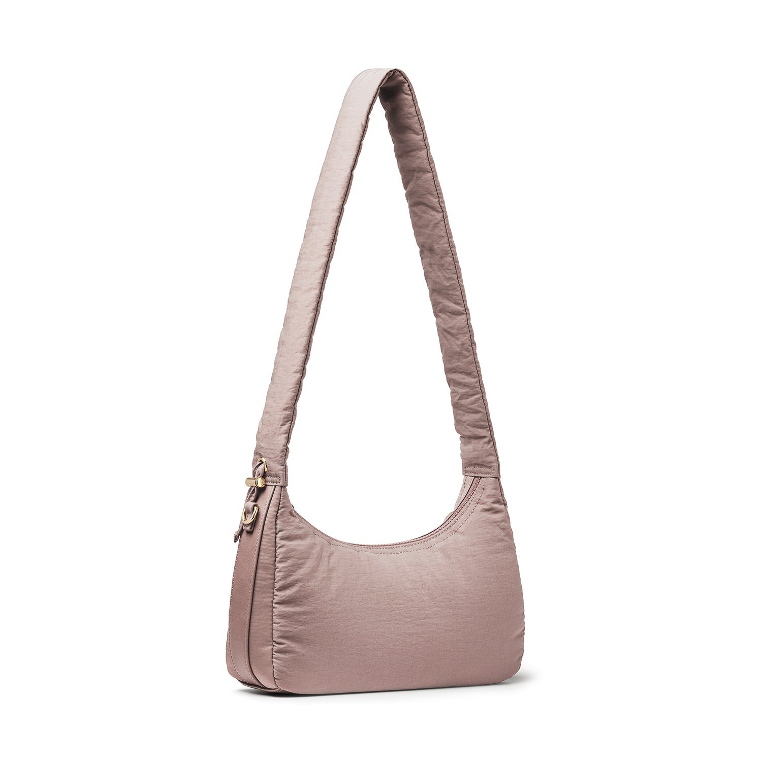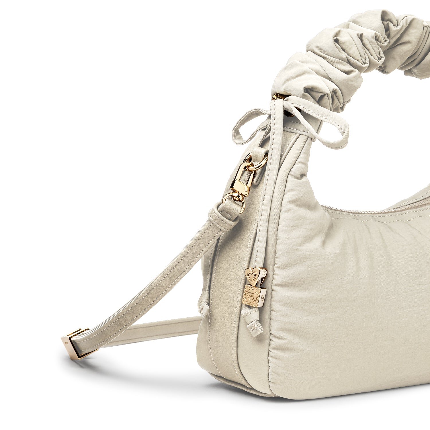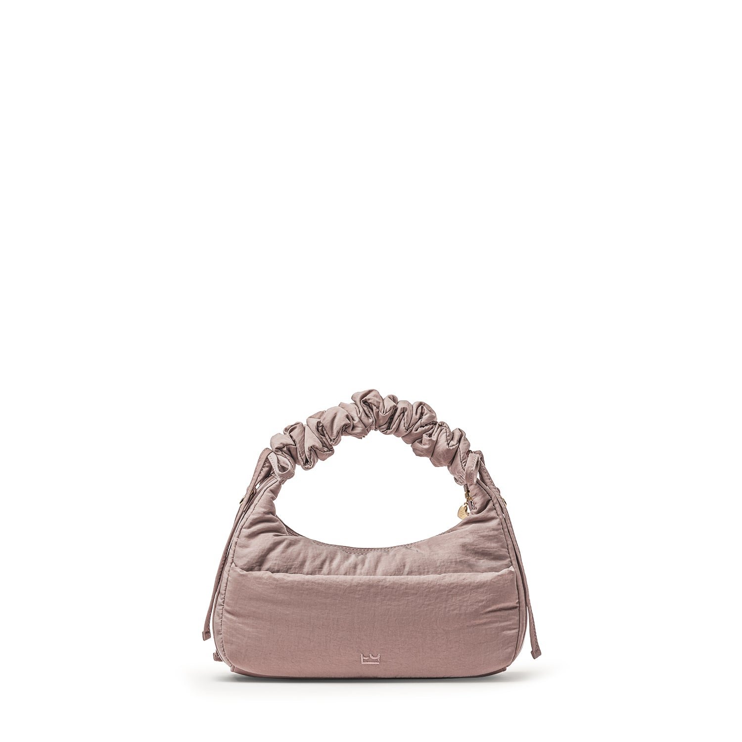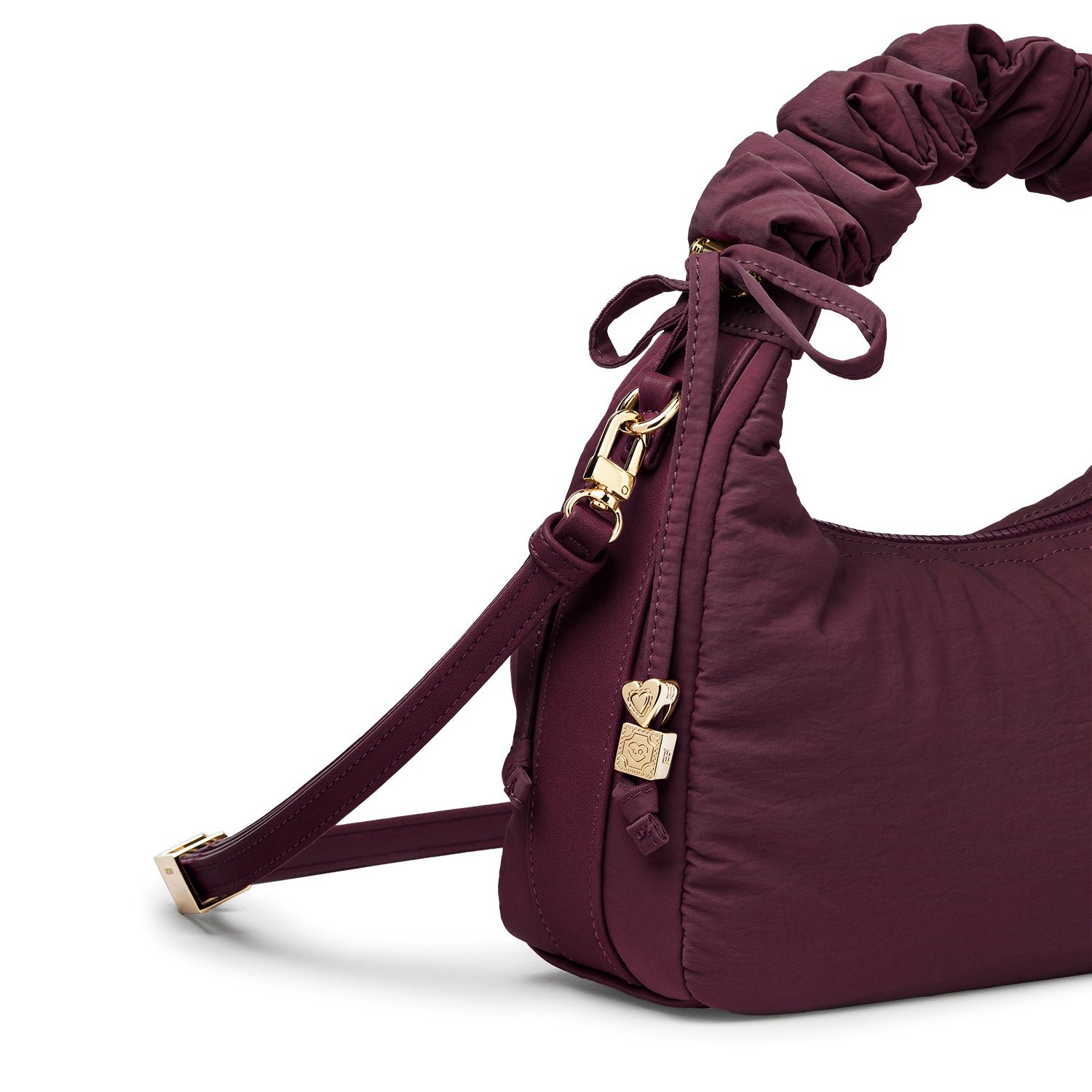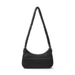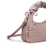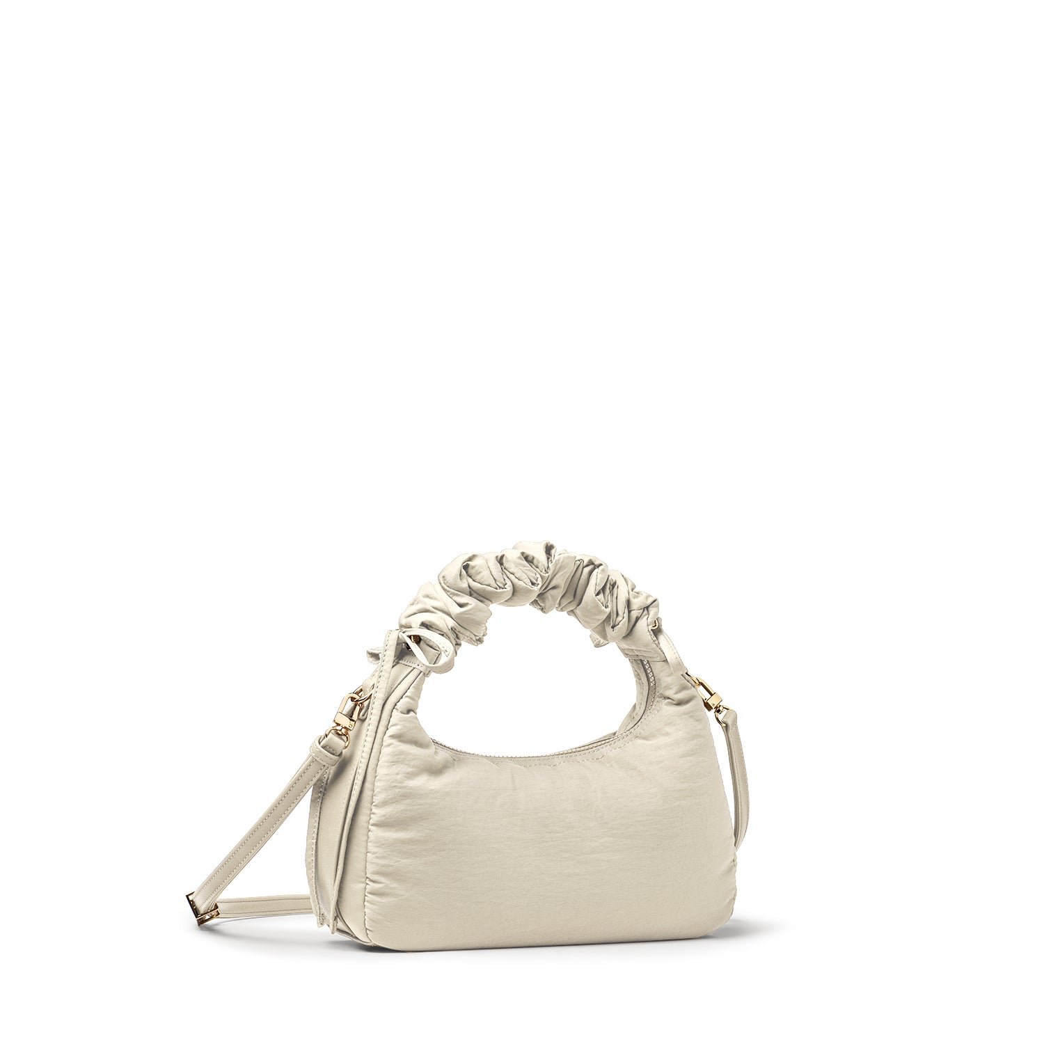 Carry it three ways: grab it by the scrunchie handle. sling it over your shoulder. or wear it crossbody with the long strap. The padded matte nylon body is water- and stain-resistant. ready to handle unexpected spills.
