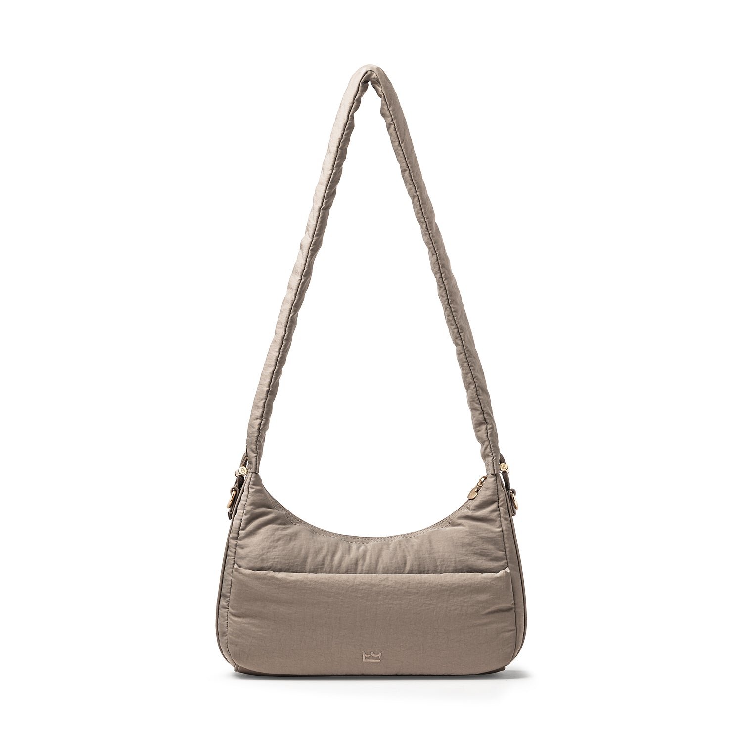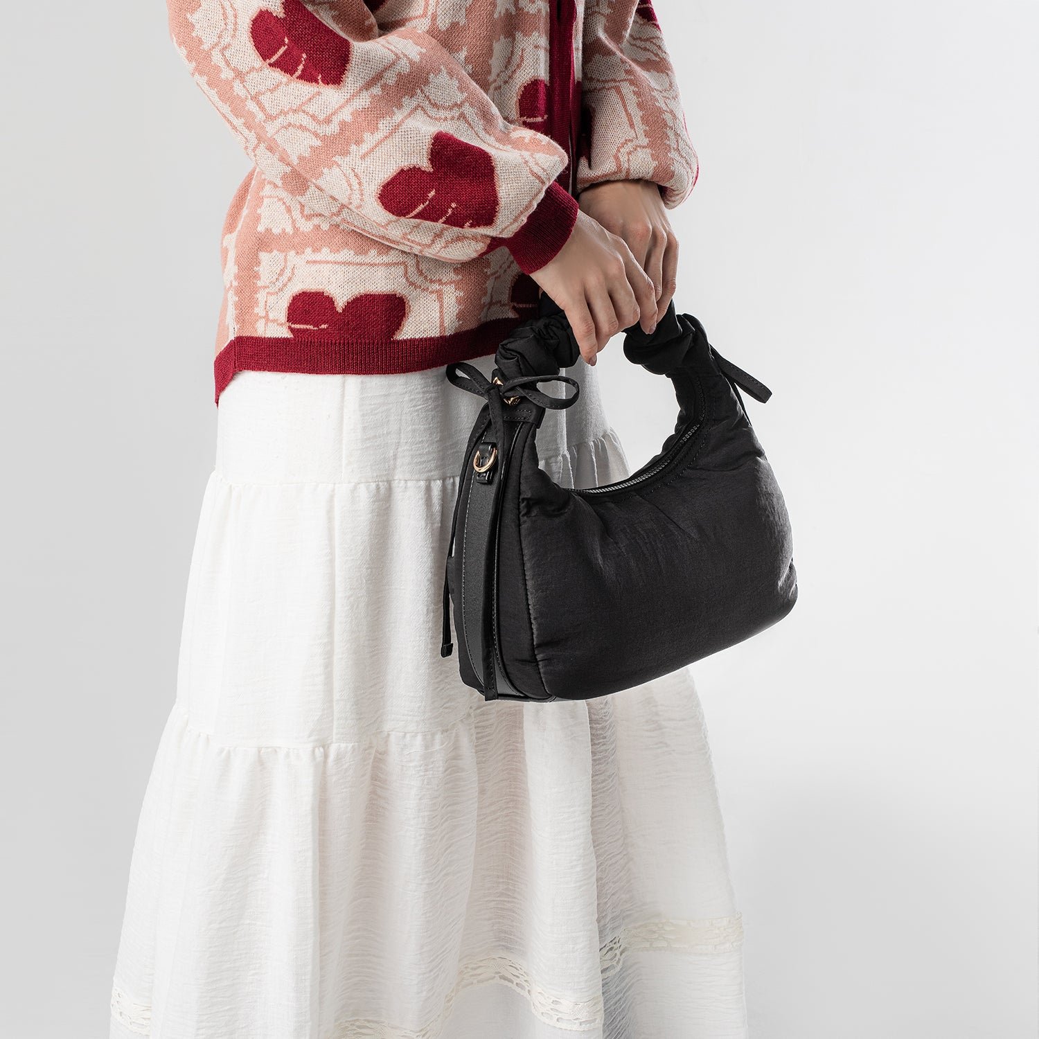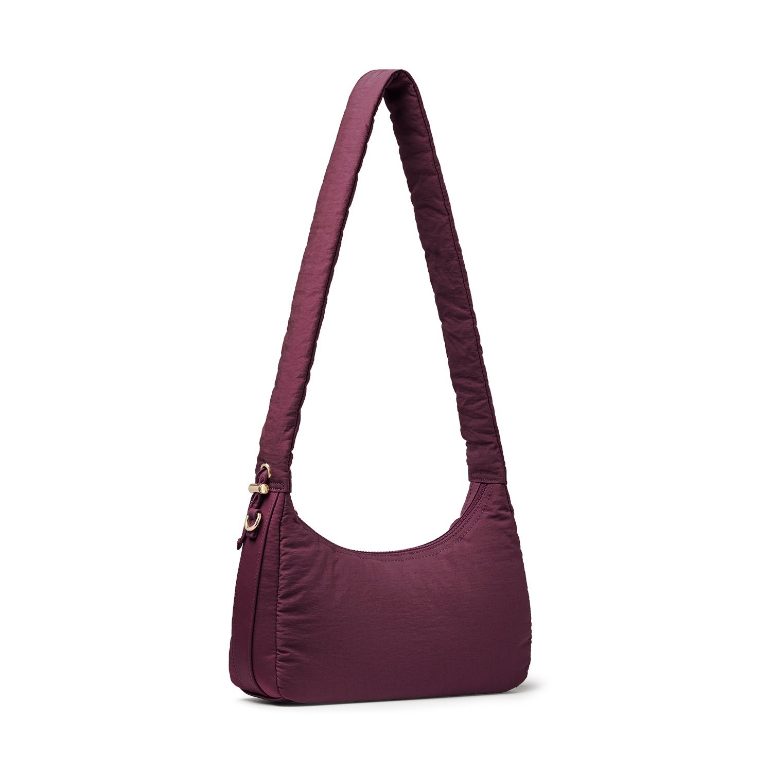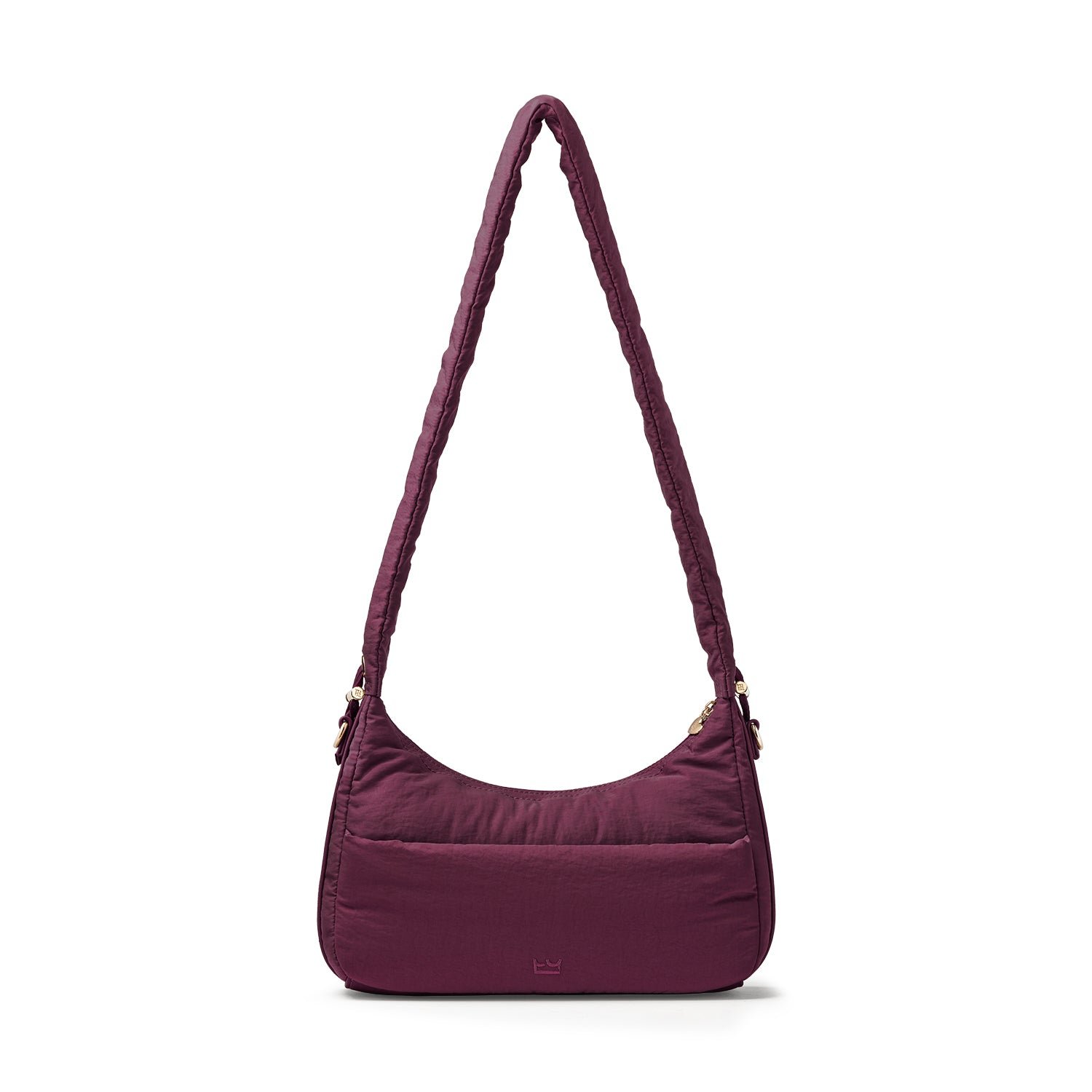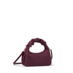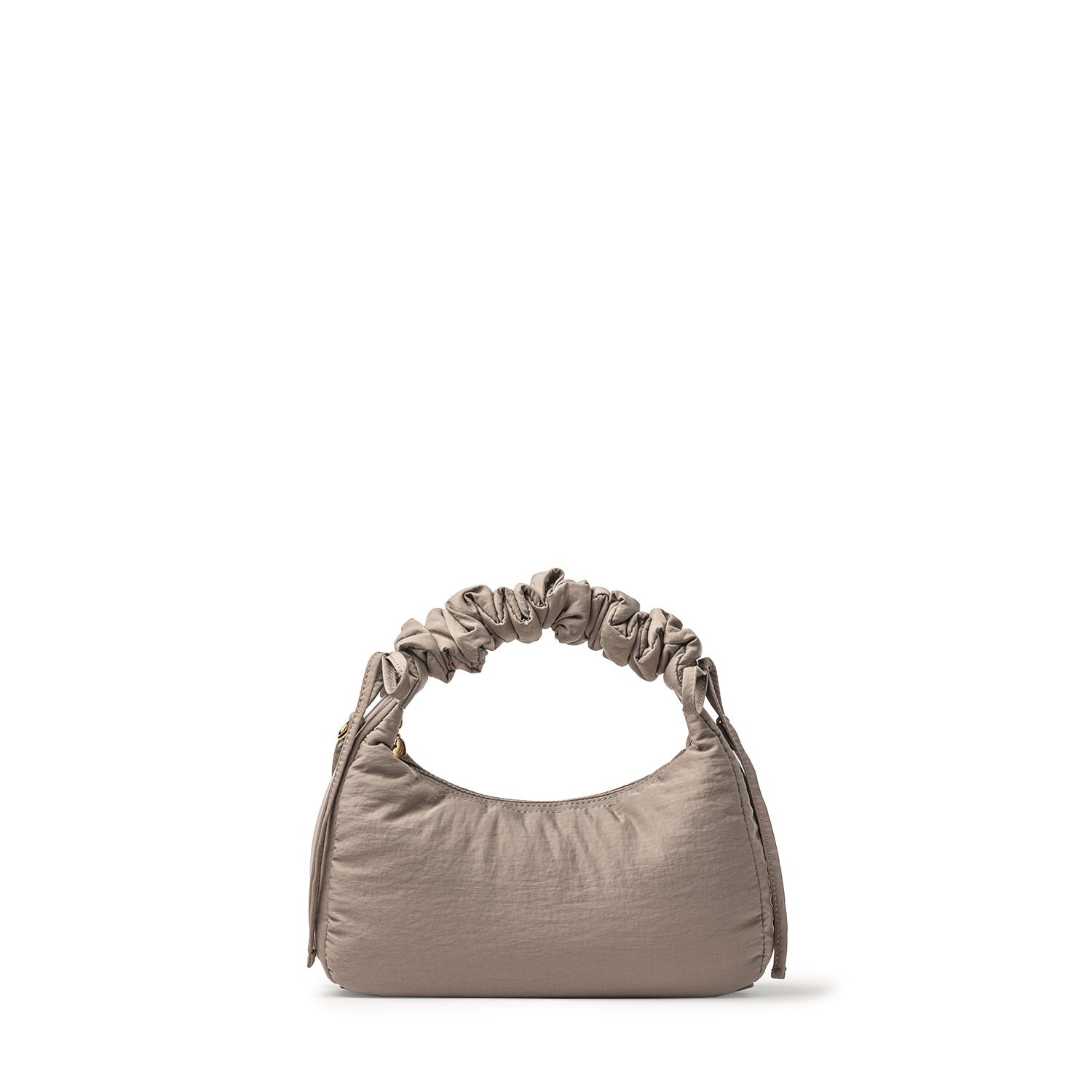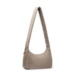 Carry it three ways: grab it by the scrunchie handle. sling it over your shoulder. or wear it crossbody with the long strap. The padded matte nylon body is water- and stain-resistant. ready to handle unexpected spills.