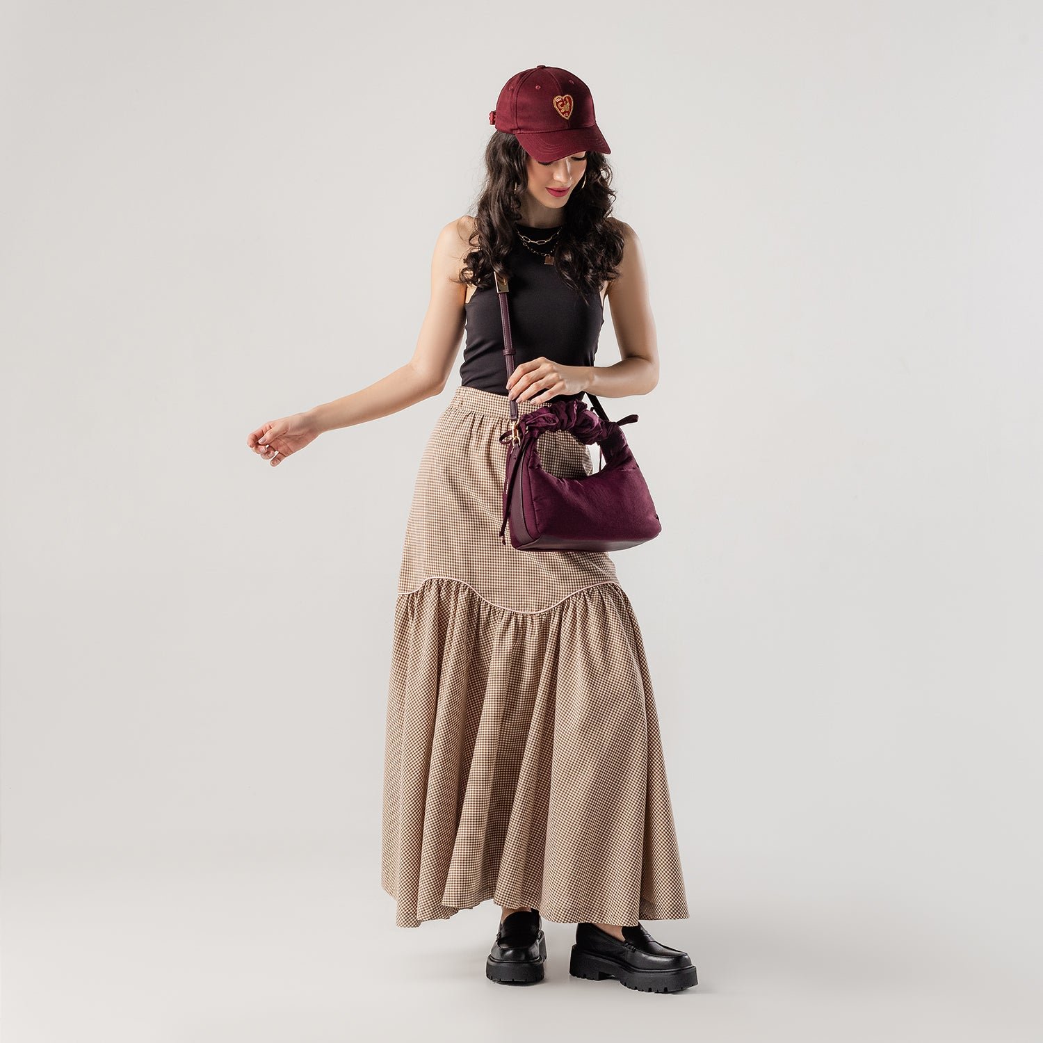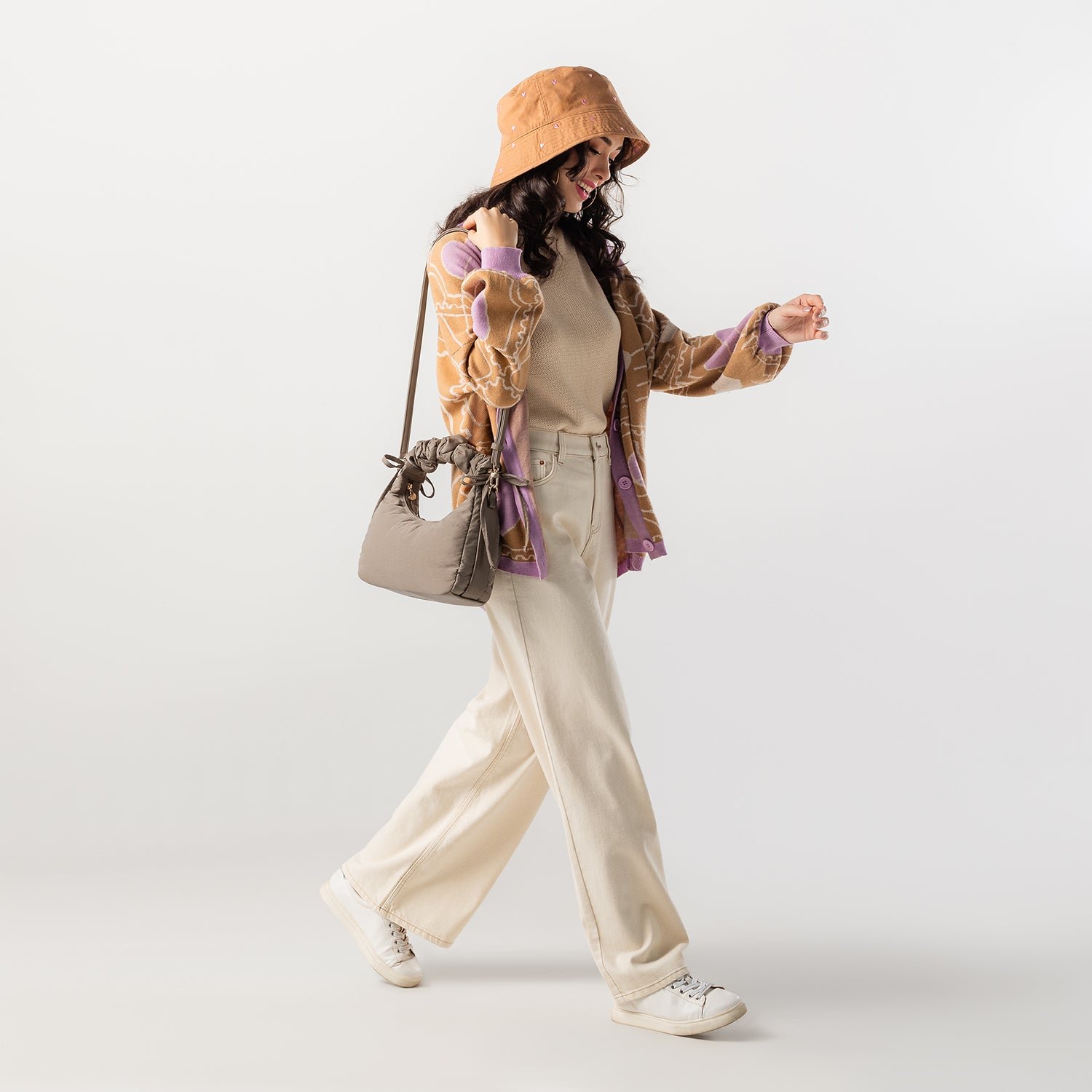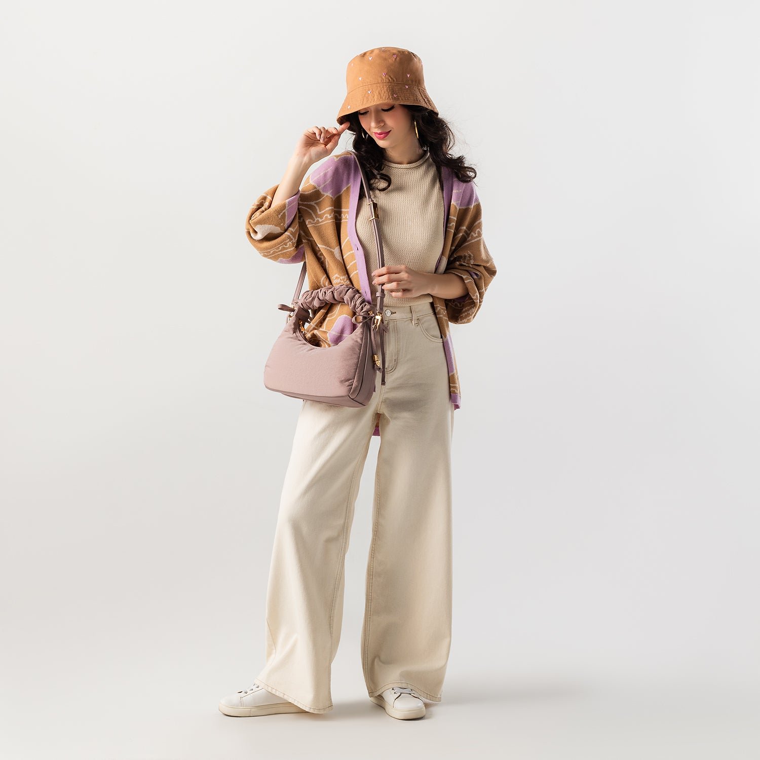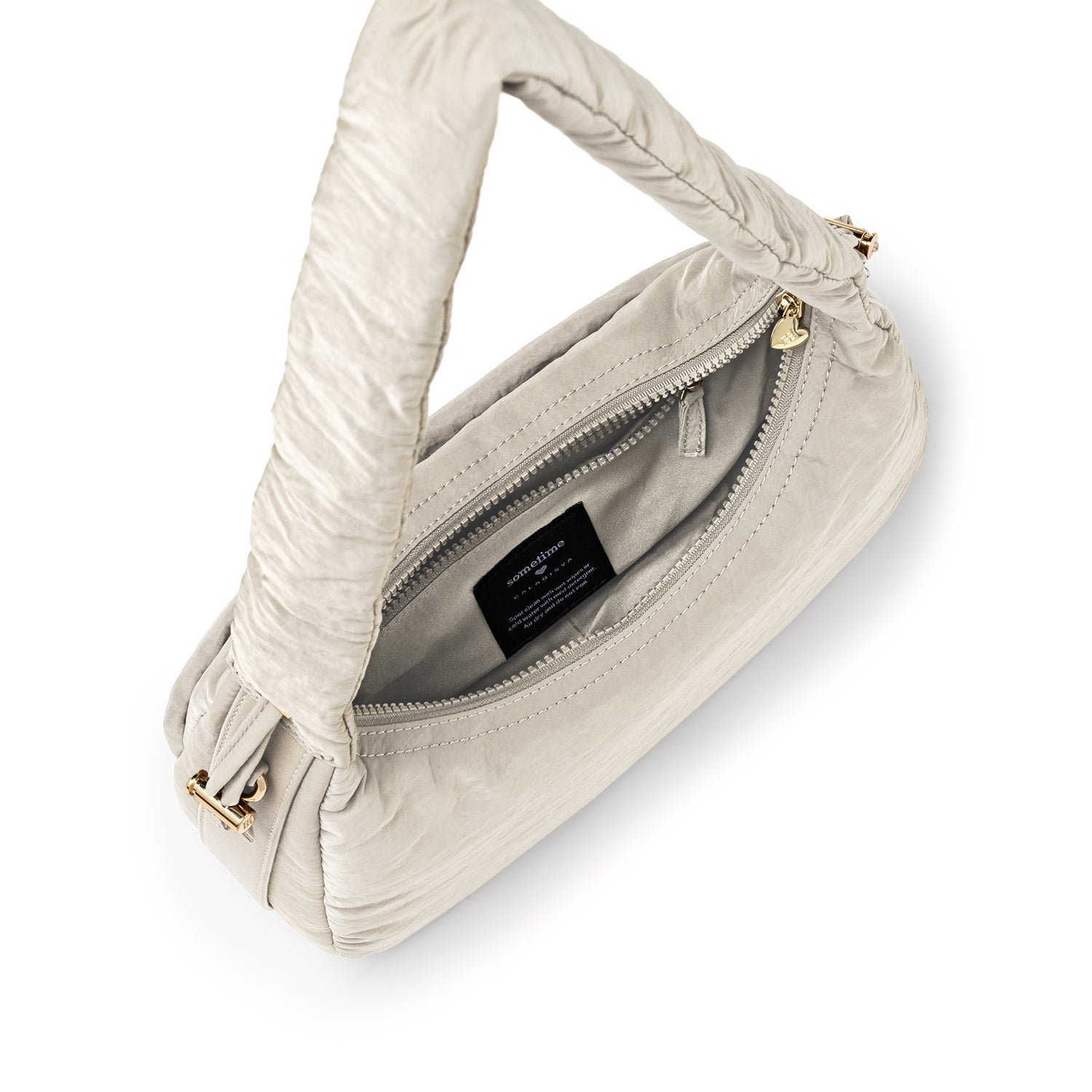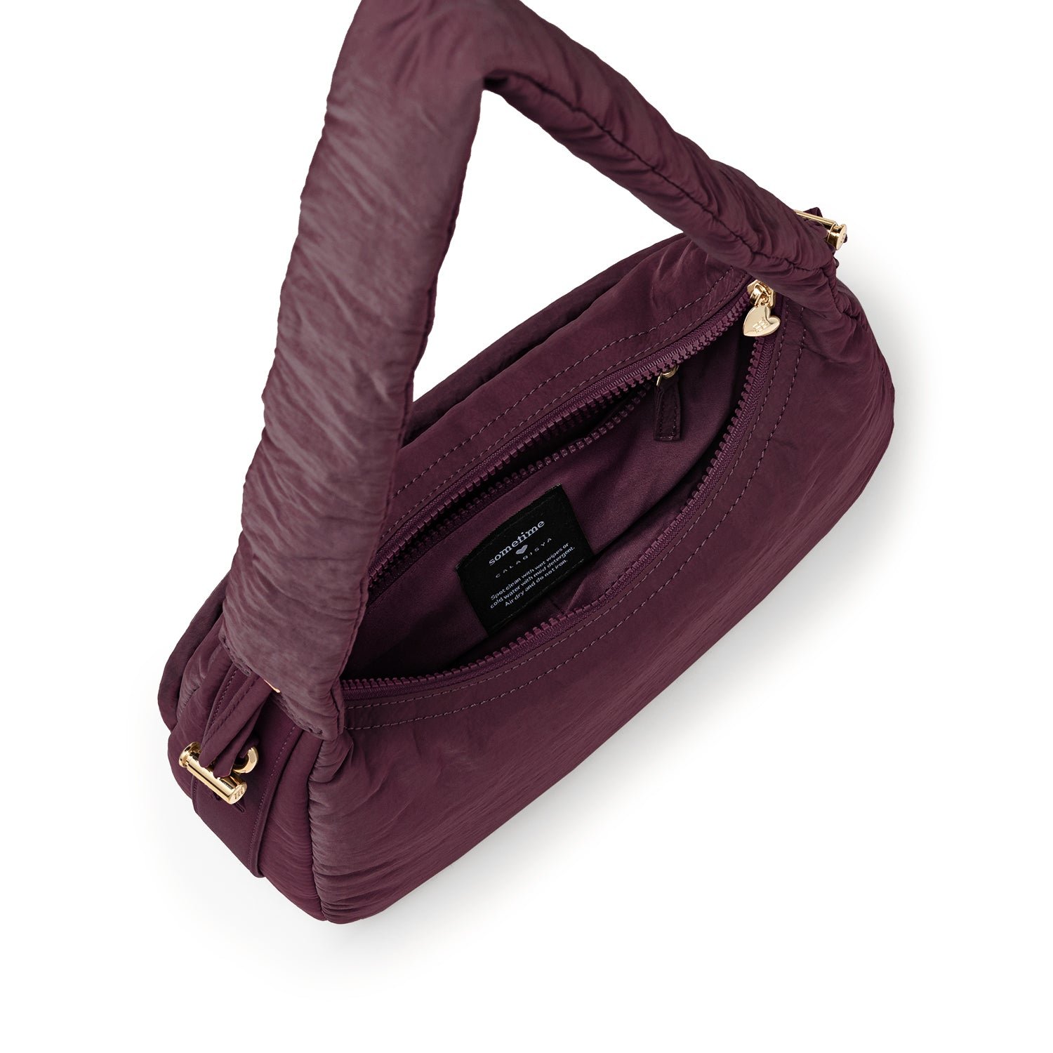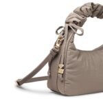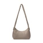 Carry it three ways: grab it by the scrunchie handle. sling it over your shoulder. or wear it crossbody with the long strap. The padded matte nylon body is water- and stain-resistant. ready to handle unexpected spills.