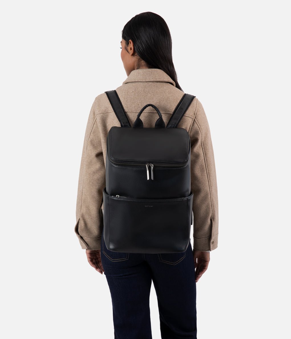 Backpack with adjustable shoulder straps. Slip pockets on the sides and front zipper pocket. Top zipper closure.