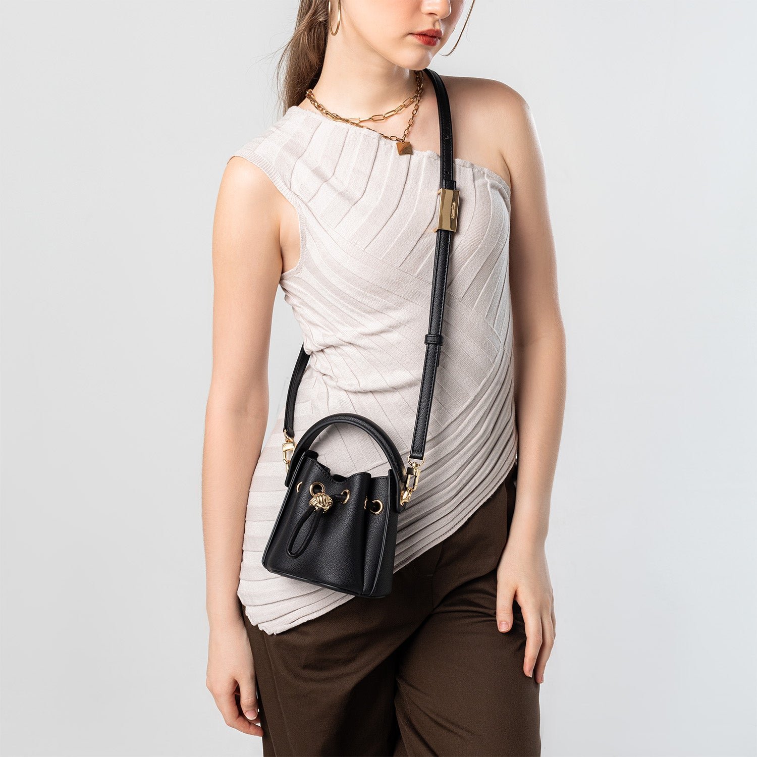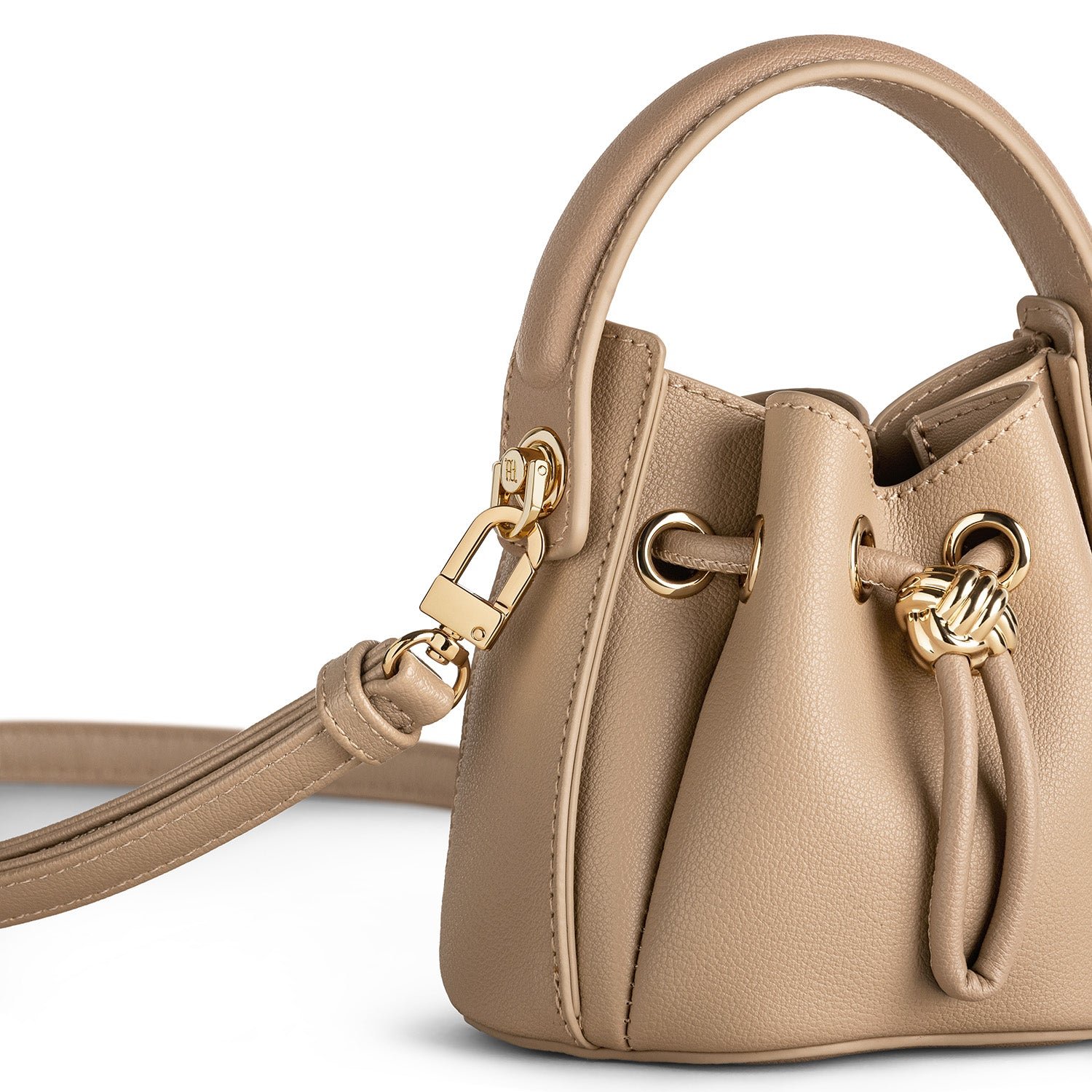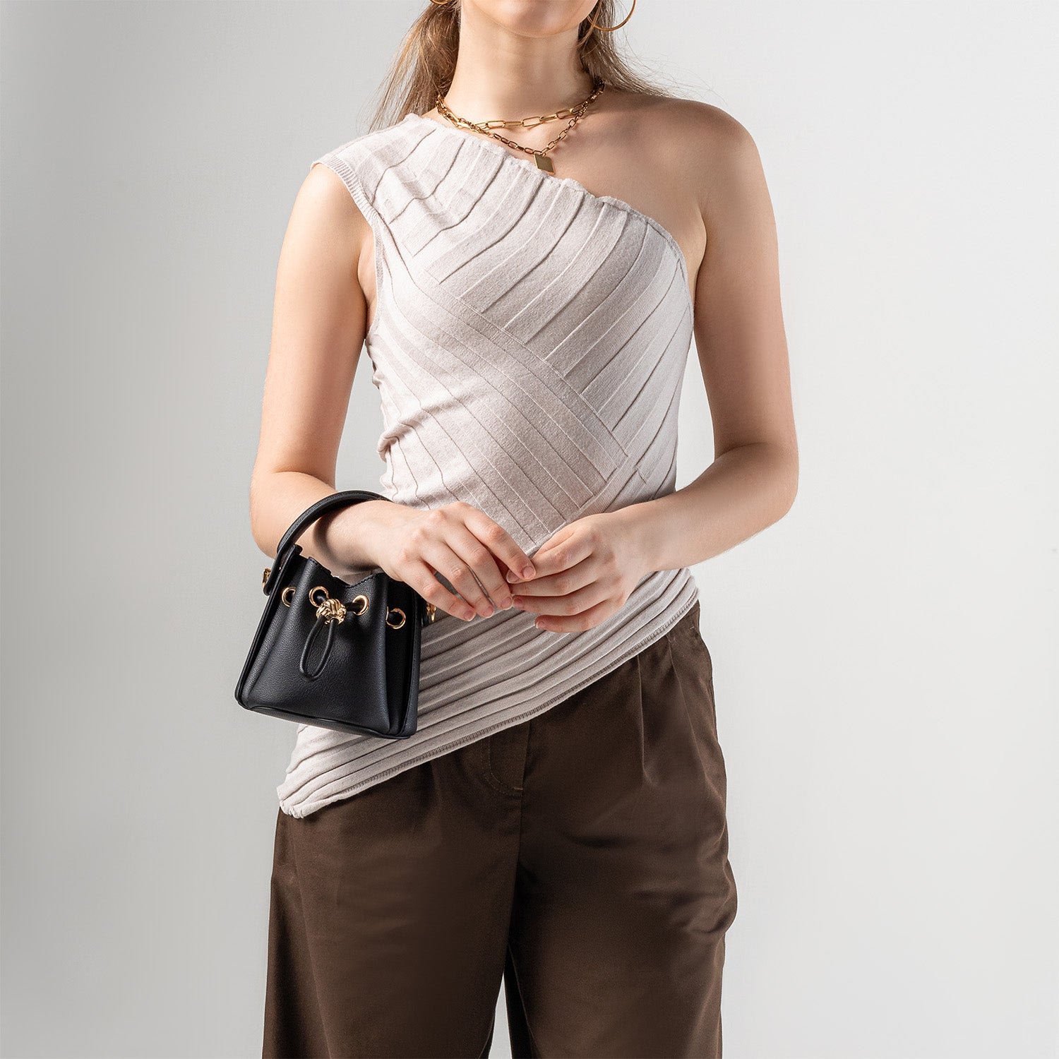 Carry it by its elegant handle or switch it to a crossbody for a more relaxed look. Ideal for date night. or a casual outing. the Knoty Mini Bucket is both graceful and refined.