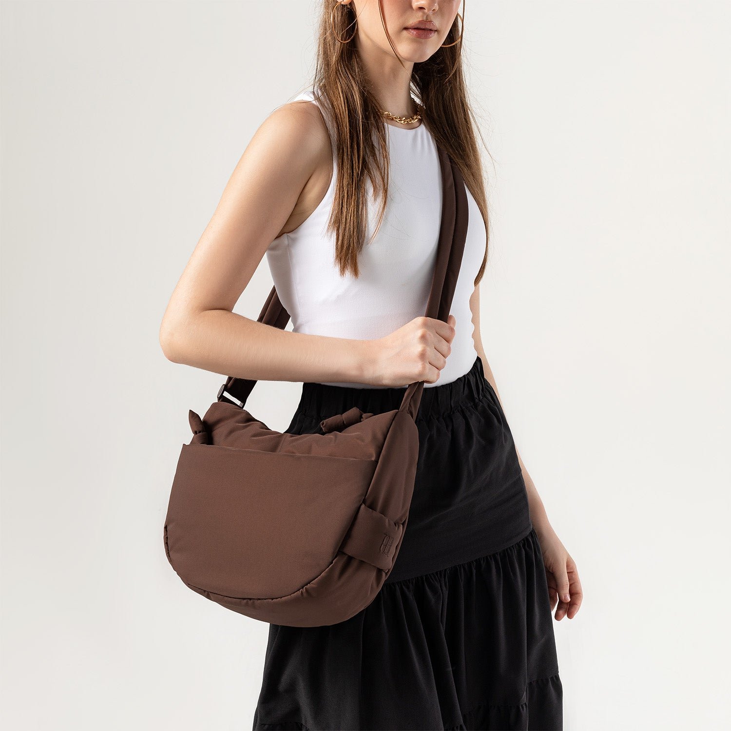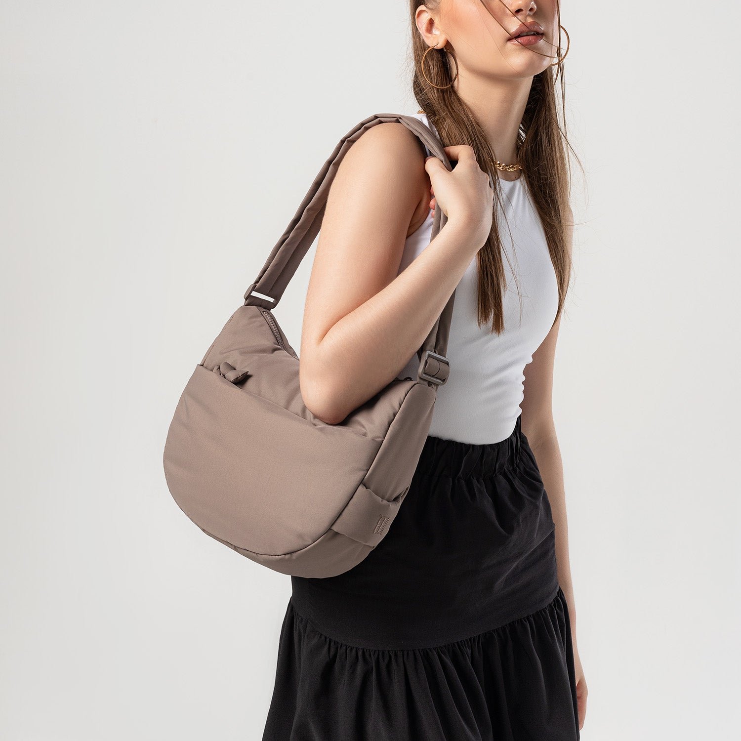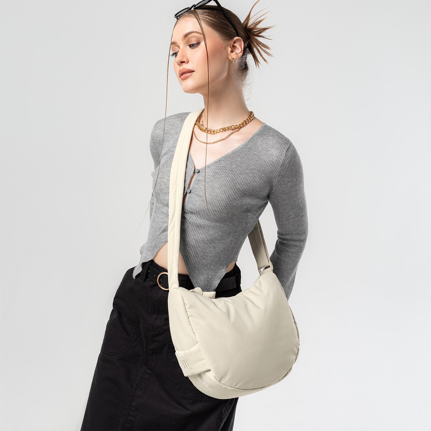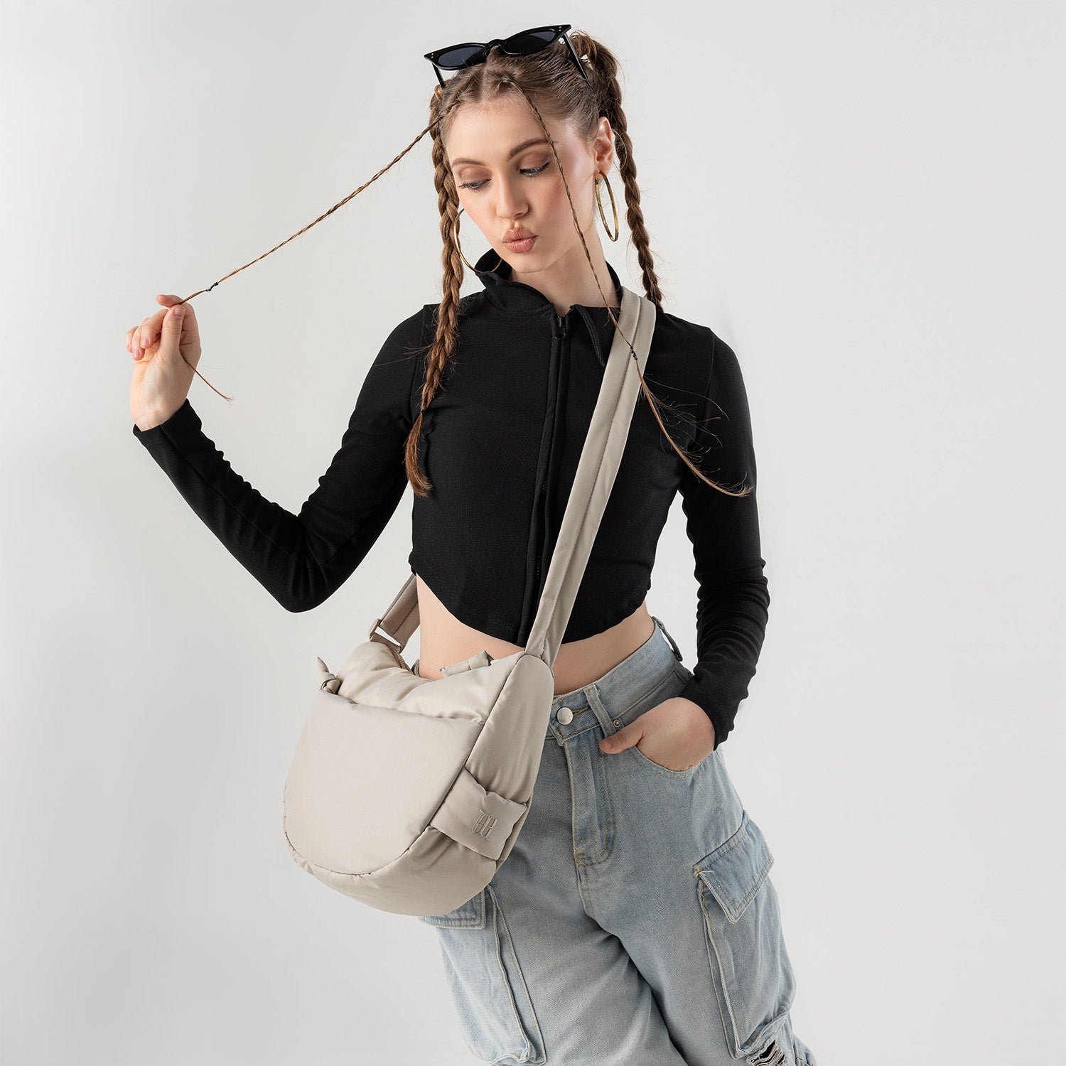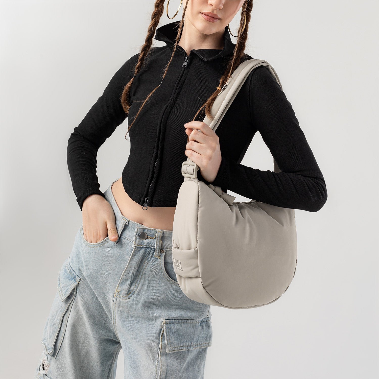 Inspired by the iconic Fuffa collection. the Soffa Hobo Bag reimagines our signature style with a focus on effortless simplicity. Crafted from soft. padded nylon. this lightweight bag boasts exceptional durability and a refined feel.
