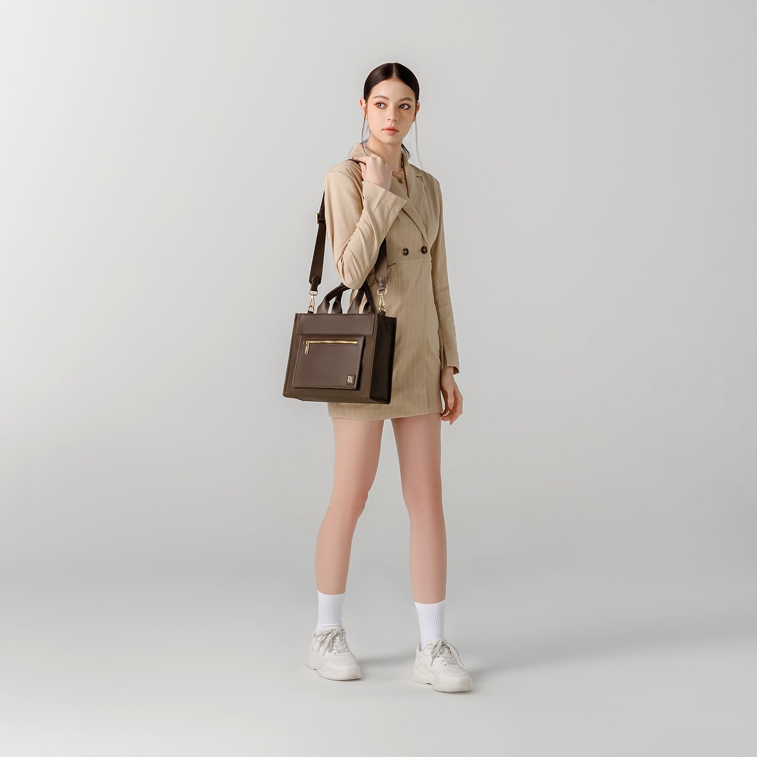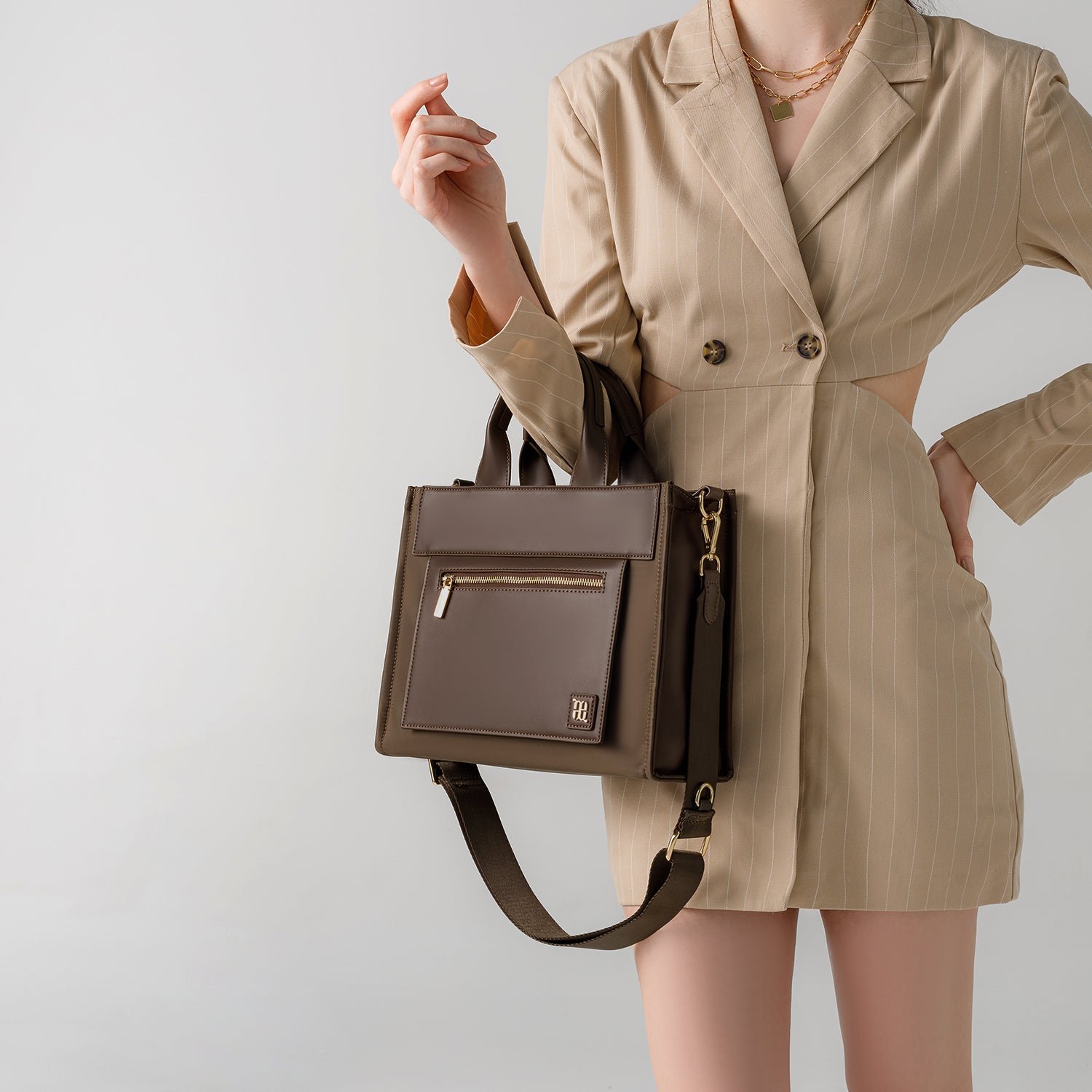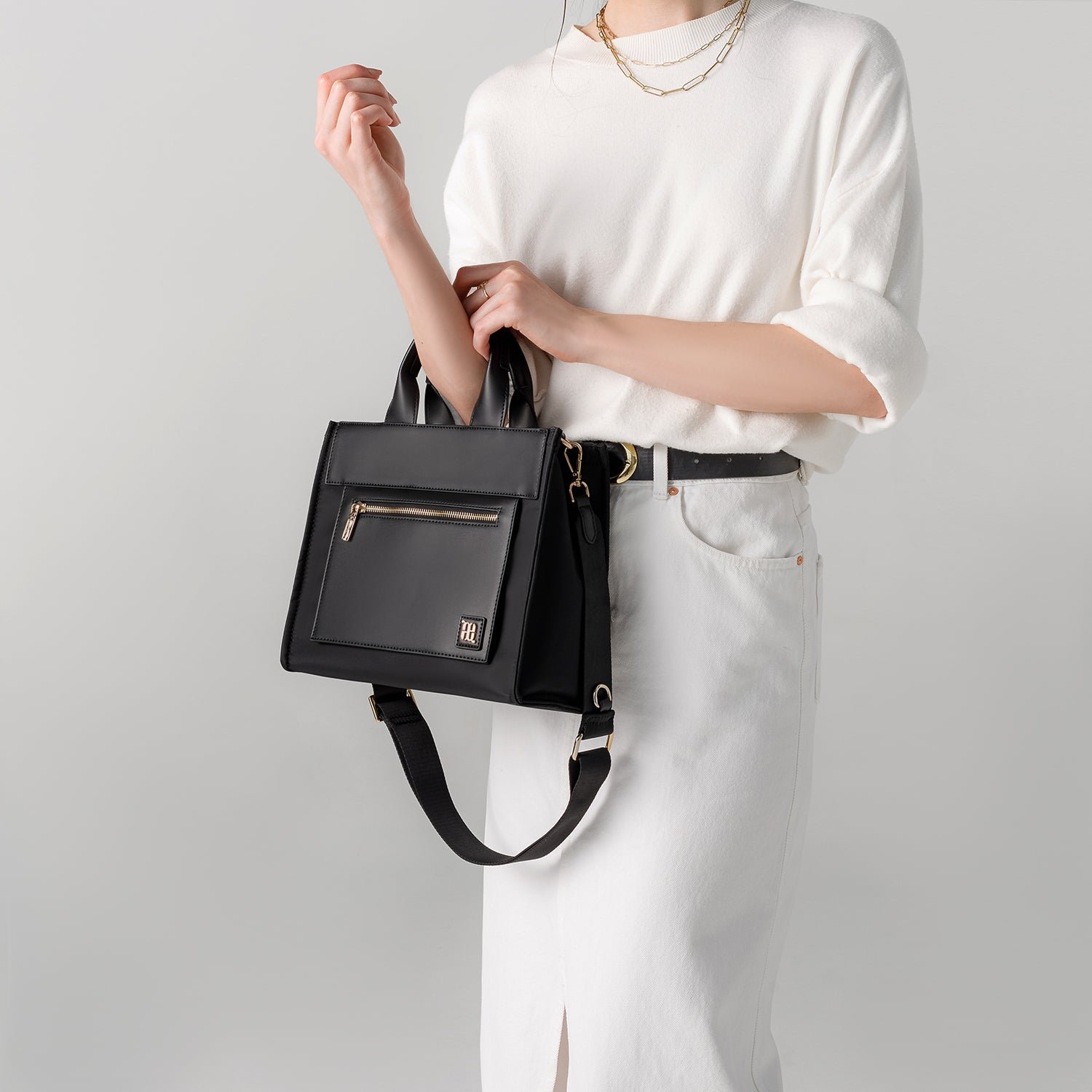 With two modes of wearing; buttery smooth synthetic leather top handles and a grosgrain crossbody strap. long-wear comfort all day is the least of your problems.