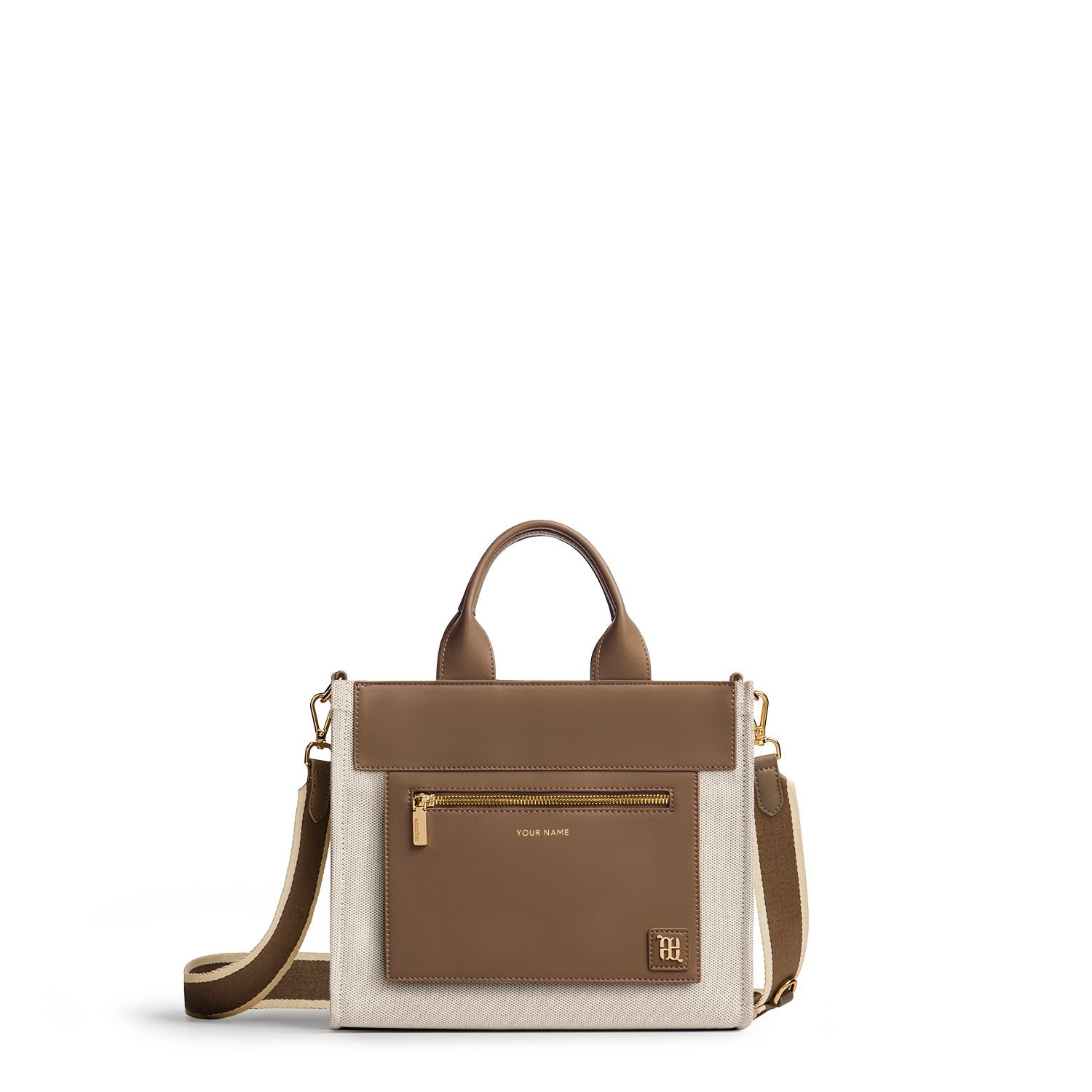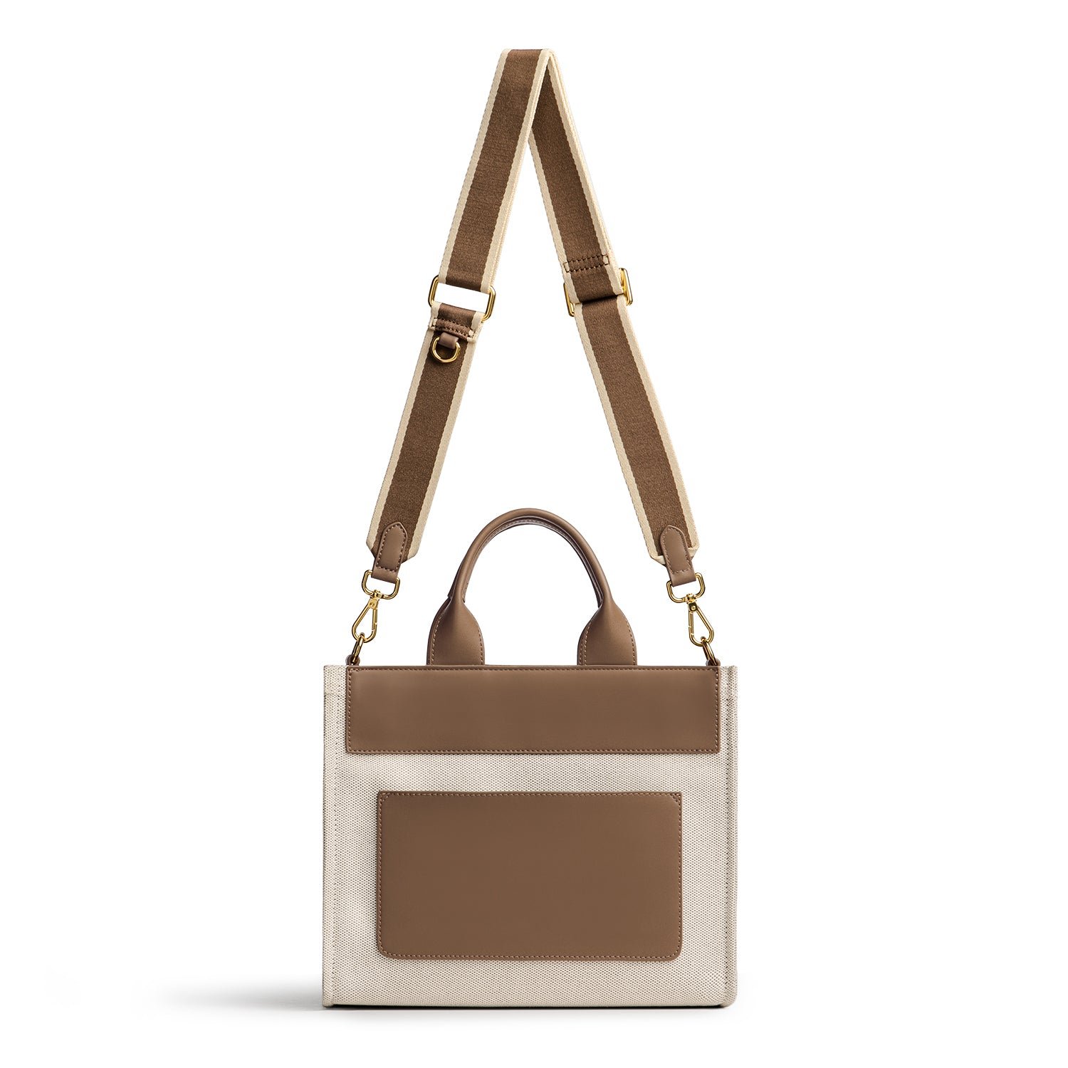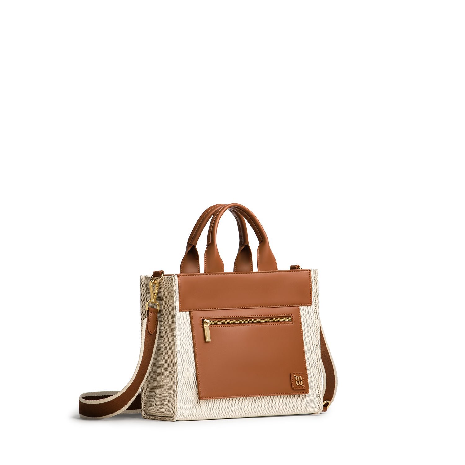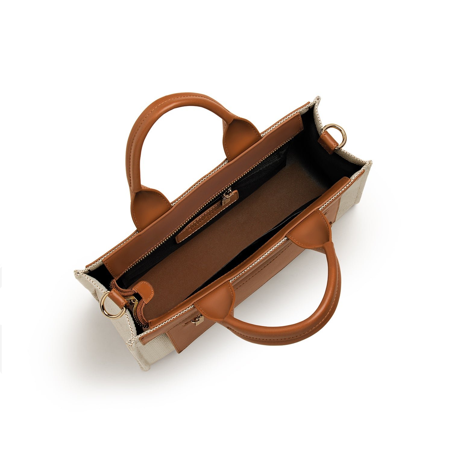 Introducing the Velia M Tote. a structured tote bag professionally crafted from premium luxe canvas and fine synthetic leather that offers practical use in one hand. and effortless class in the other.