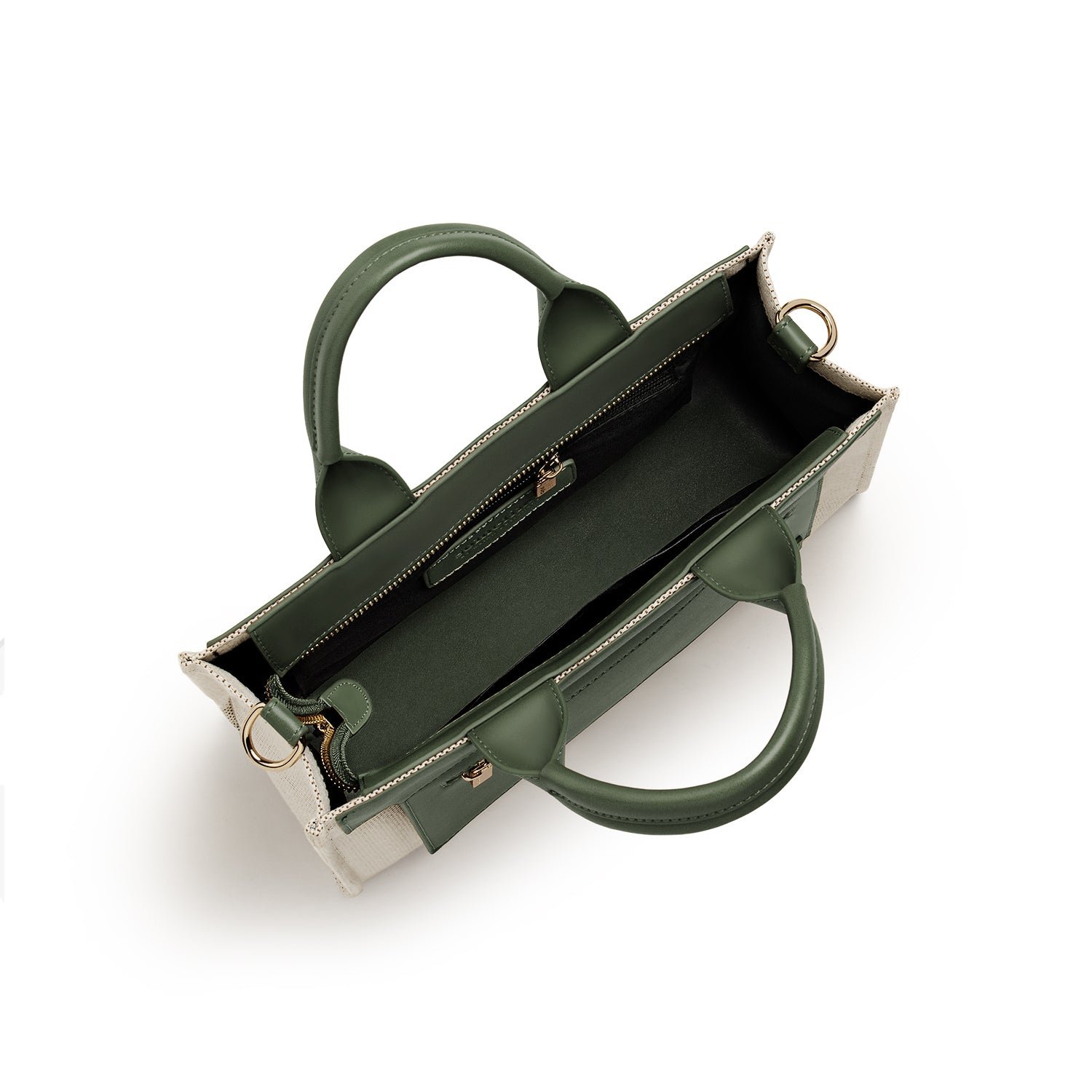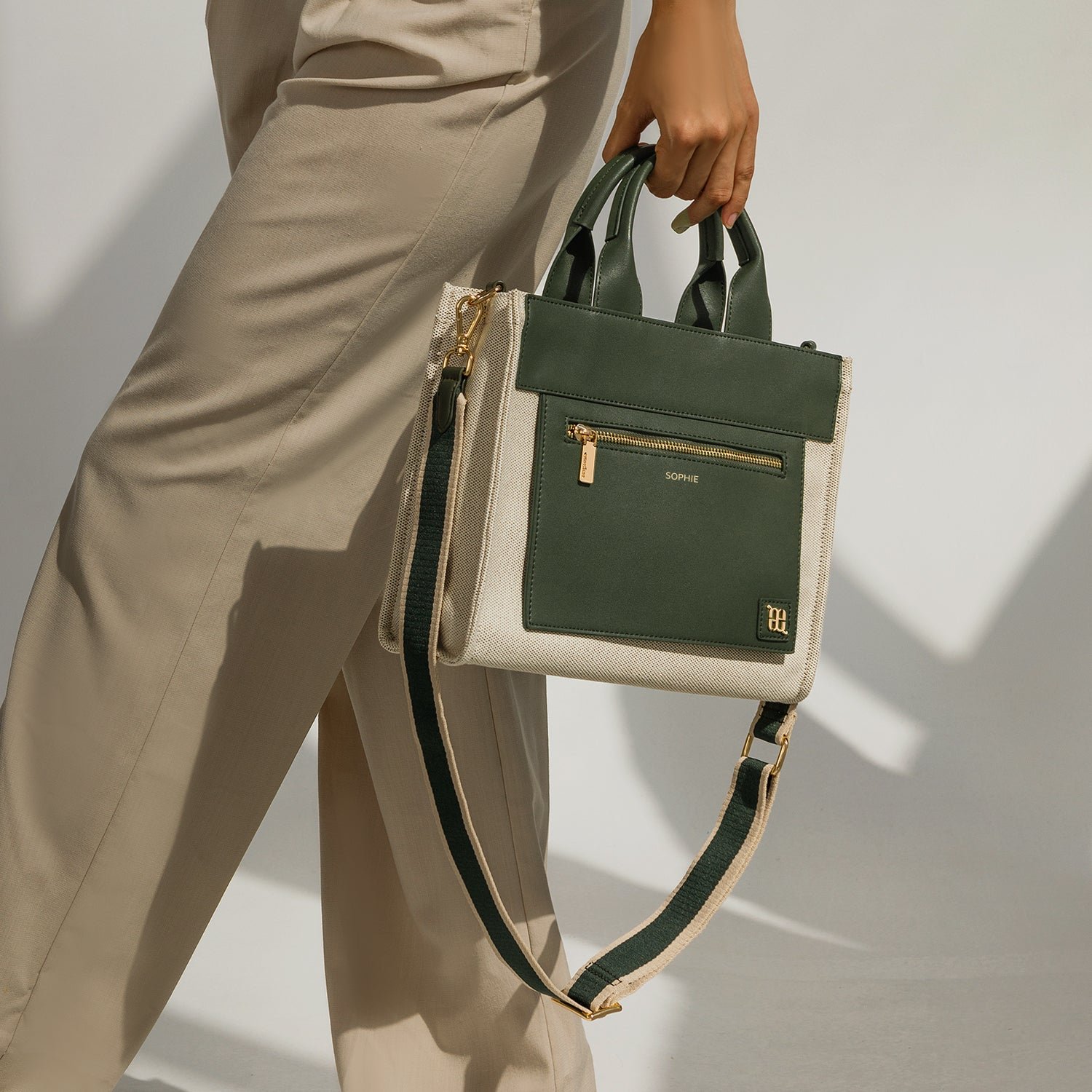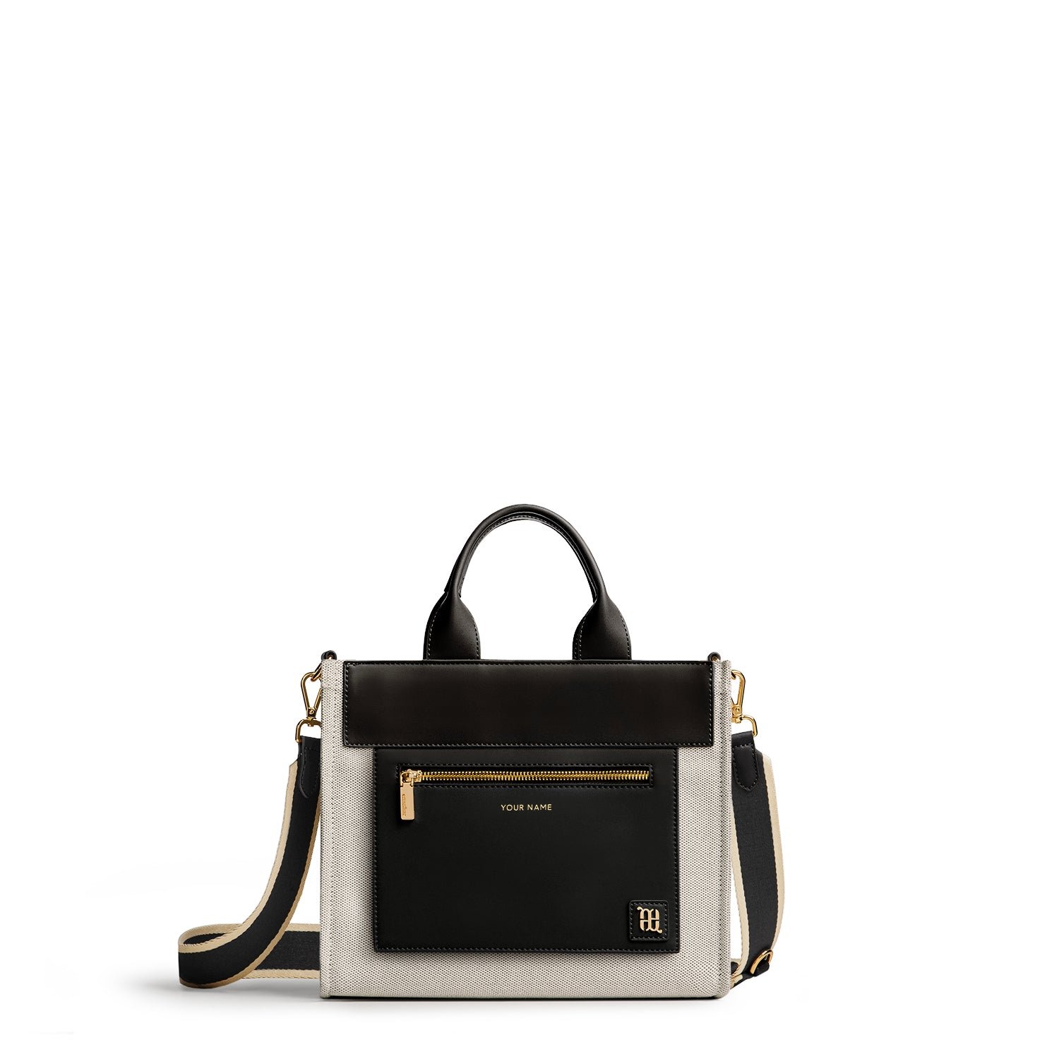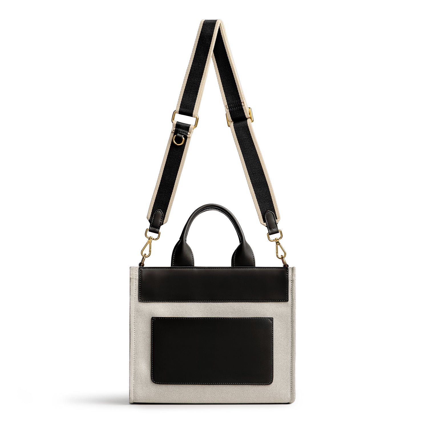 Introducing the Velia M Tote. a structured tote bag professionally crafted from premium luxe canvas and fine synthetic leather that offers practical use in one hand. and effortless class in the other.