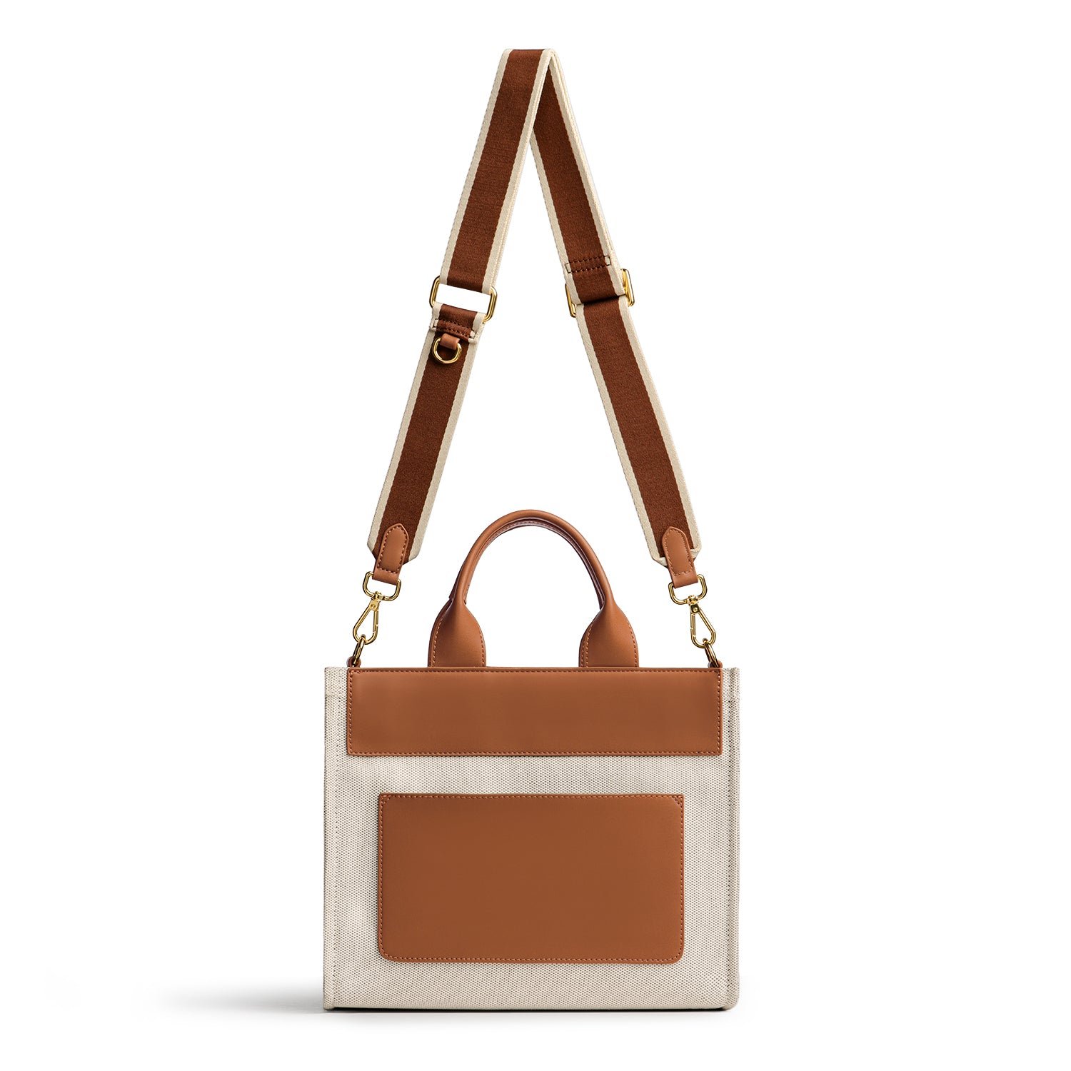 With two modes of wearing; buttery smooth synthetic leather top handles and a grosgrain crossbody strap. long-wear comfort all day is the least of your problems.