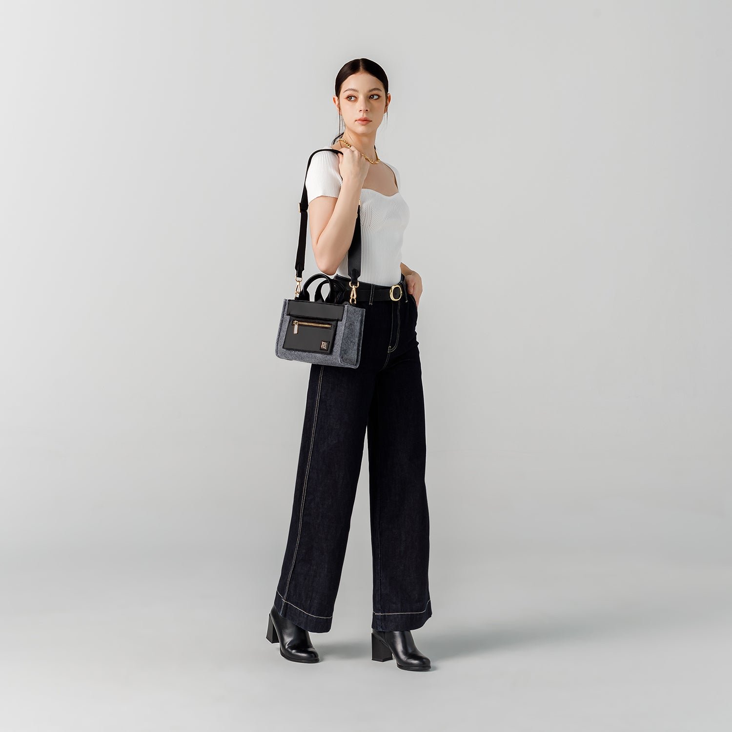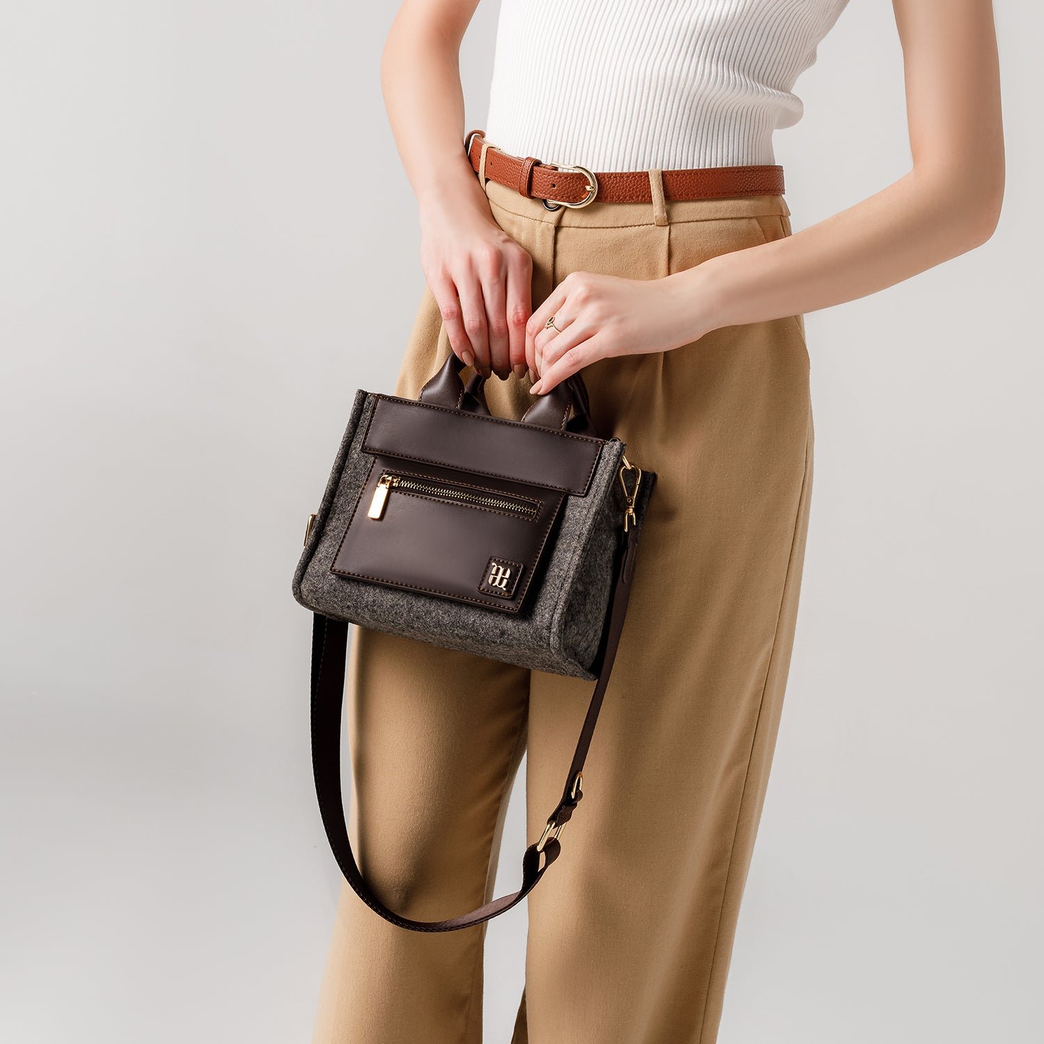 Meet the Velia S Tote. your next small. reliable. and structured tote bag professionally crafted from premium felt and fine synthetic leather that offers practical use in one hand. and effortless class in the other.